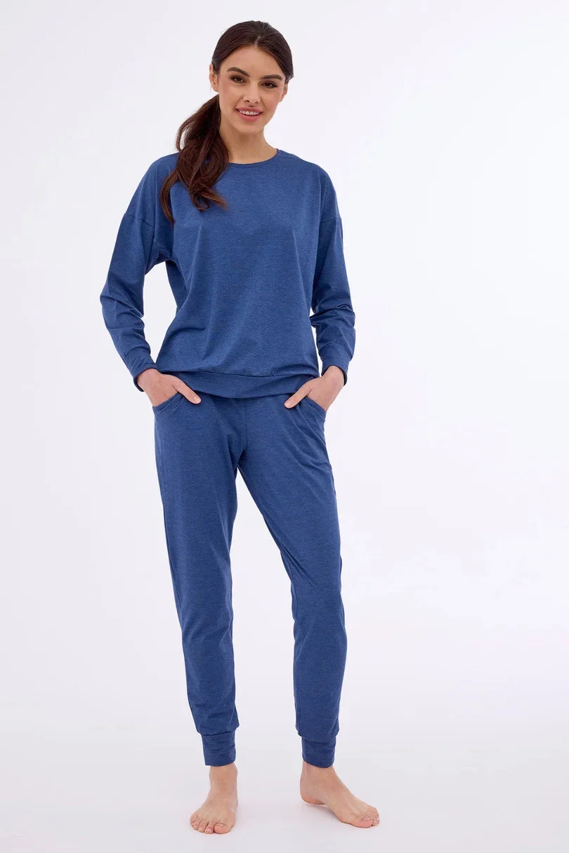 Dámská tepláková souprava z melanžového úpletu s dlouhými rukávy a dlouhými nohavicemi s kapsami. Výstřih, manžety a spodní lem trička a nohavic jsou zakončeny pohodlným žebrovaným lemem.
