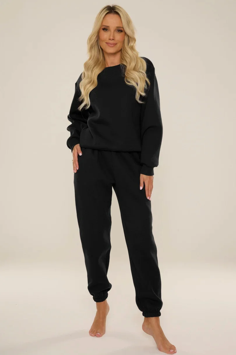 Dámská tepláková souprava s dlouhým rukávem, hřejivou fleecovou podšívkou na vnitřní straně, dlouhými kalhotami s kapsami, nohavicemi s pohodlnou šňůrkou v pase.