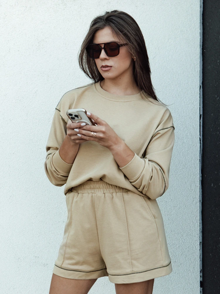 Komplet dresowy, który przyciąga uwagę niepowtarzalnym designem. Luźna bluza z oryginalnymi przeszyciami łączy komfort z unikalnym stylem, a krótkie spodenki podkreślają swobodny charakter zestawu. Idealny do noszenia w domu lub na casualowe wyjścia, zapewniając wygodę i swobodę.