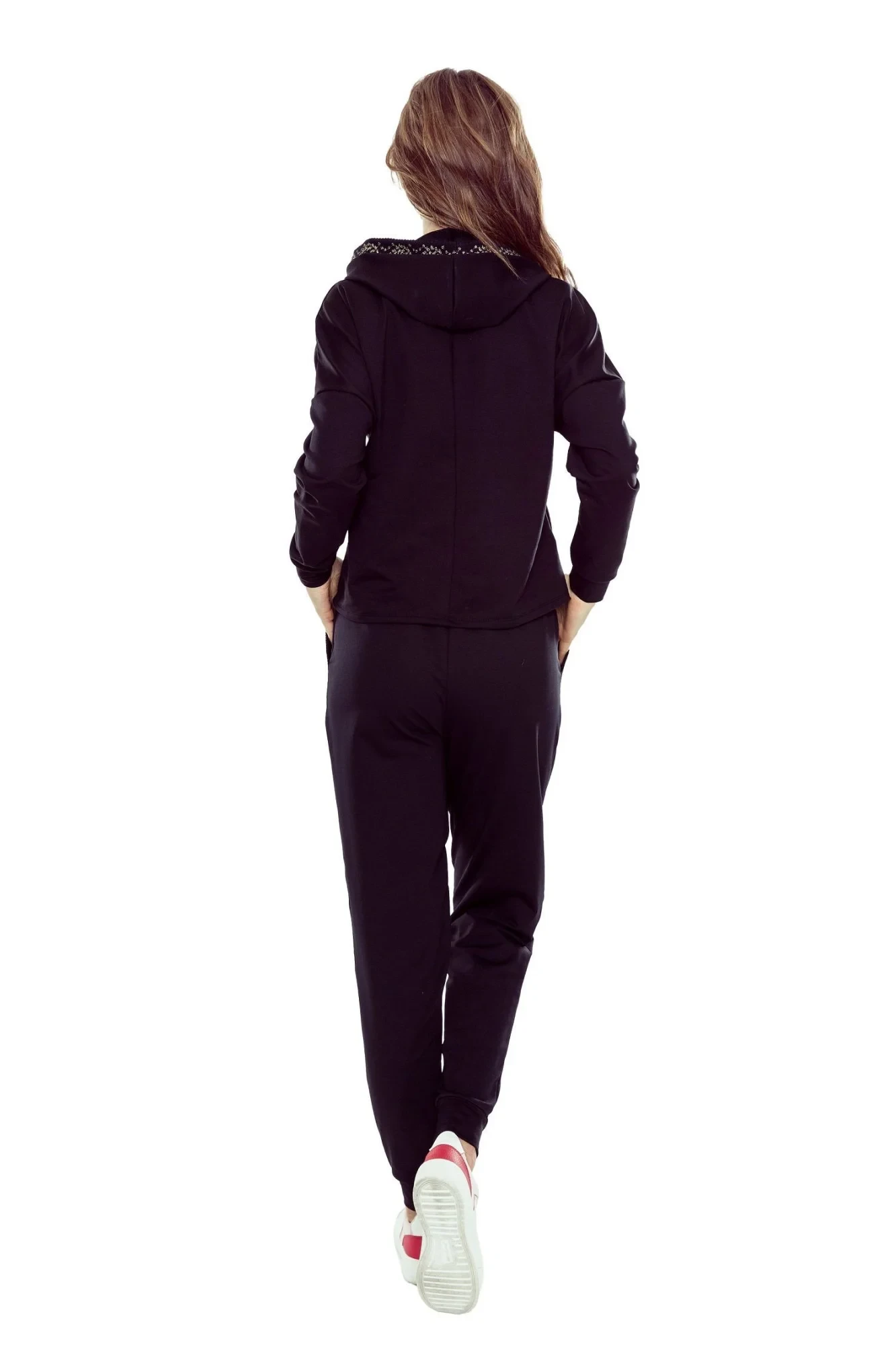 Dámská tepláková souprava Ferbi black ELDAR - černá barva - z tenké teplákoviny - mikina s kapucí - dlouhé volné kalhoty zúžené směrem dolů - kapuce a kapsy zakončené krajkou s jemnou zlatou nitíMateriálové složení: 70% bavlna + 25% polyester + 5% elastan