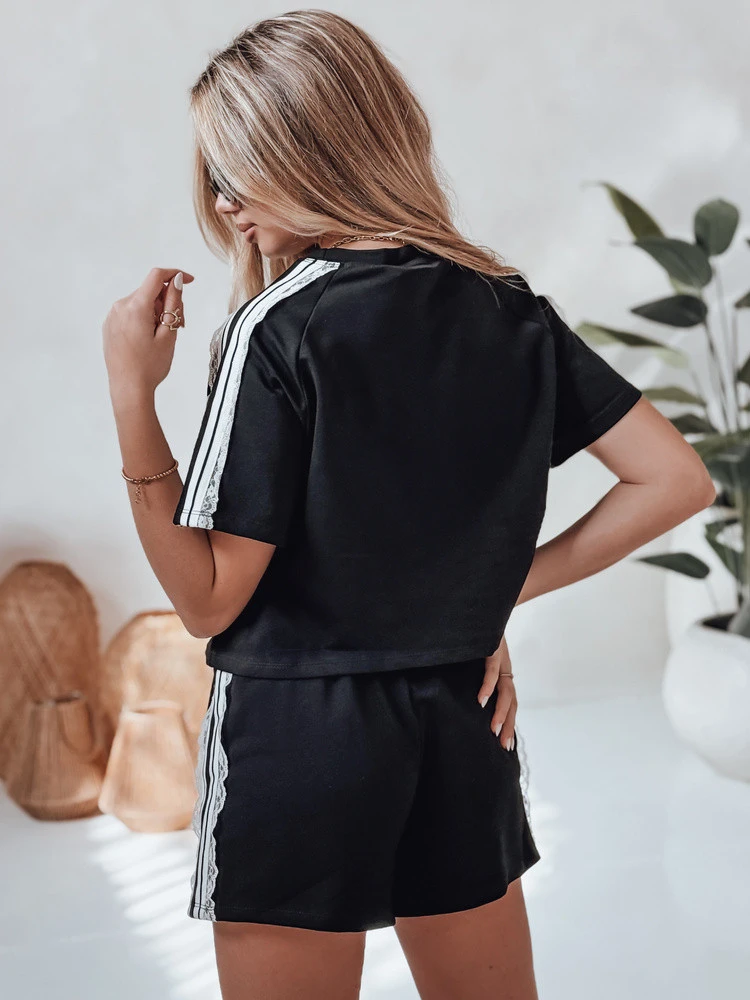 Dámská tepláková souprava je stylovou kombinací sportovní ležérnosti a ženské elegance. Nadměrné krátké tričko upoutá pozornost nápisem "sport" a pruhy s ozdobnou krajkou na rukávech. Šortky s elastickým pasem a vázáním zajišťují maximální pohodlí, zatímco krajkové vsadky na bocích zeštíhlují siluetu a dodávají módní nádech. Souprava je ideální pro každodenní nošení nebo na letní procházky.