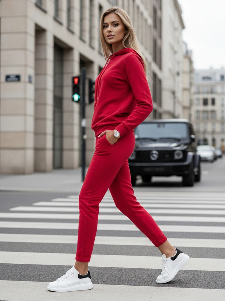Tato stylová dámská tepláková souprava je kombinací pohodlí a moderního designu. Skládá se z mikiny s kapucí a odpovídajících kalhot, které vytvářejí ucelený a funkční komplet pro každodenní nošení. Minimalistická forma se bude dobře hodit jak pro městskou stylizaci, tak pro každodenní relaxaci.