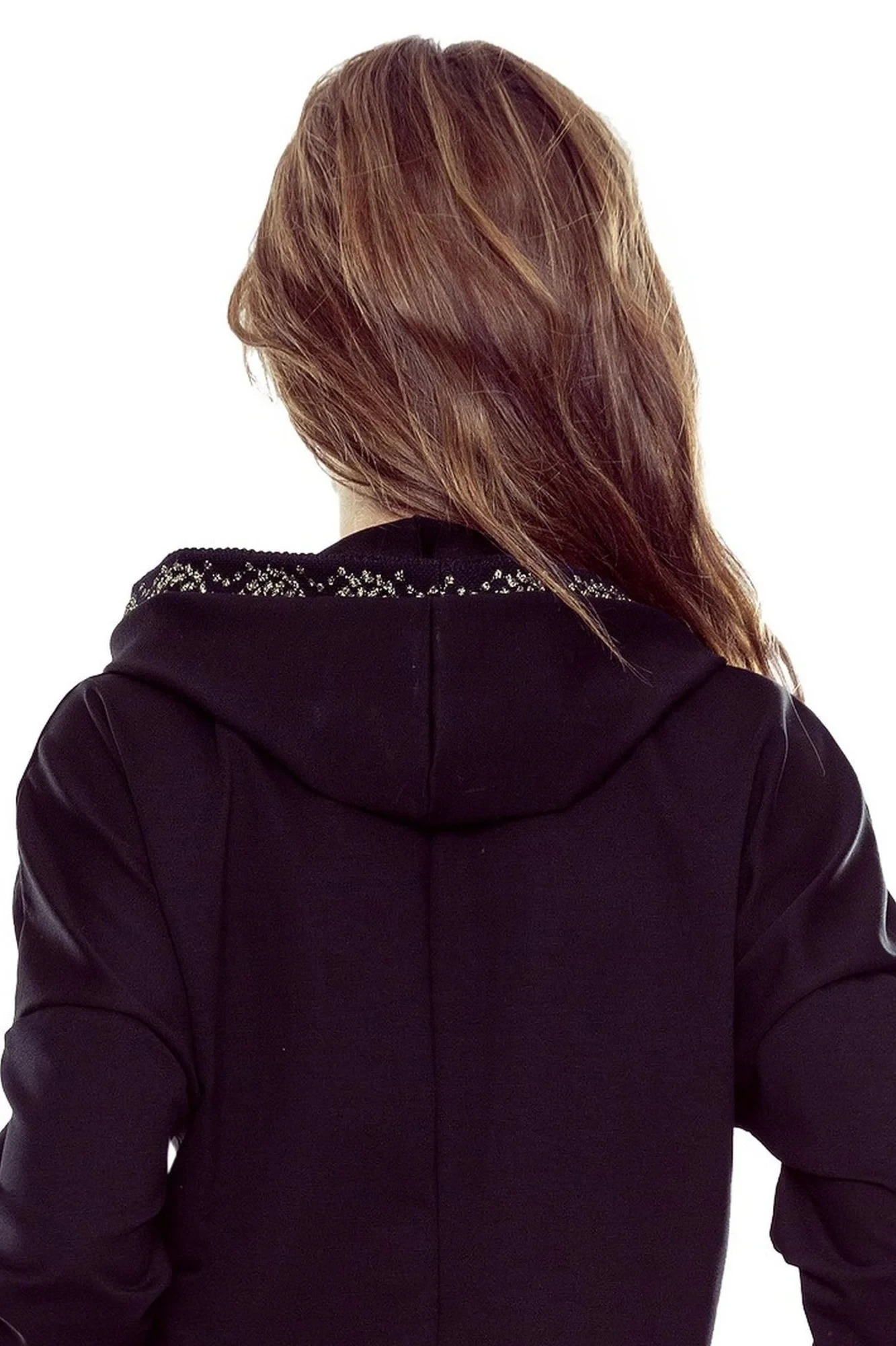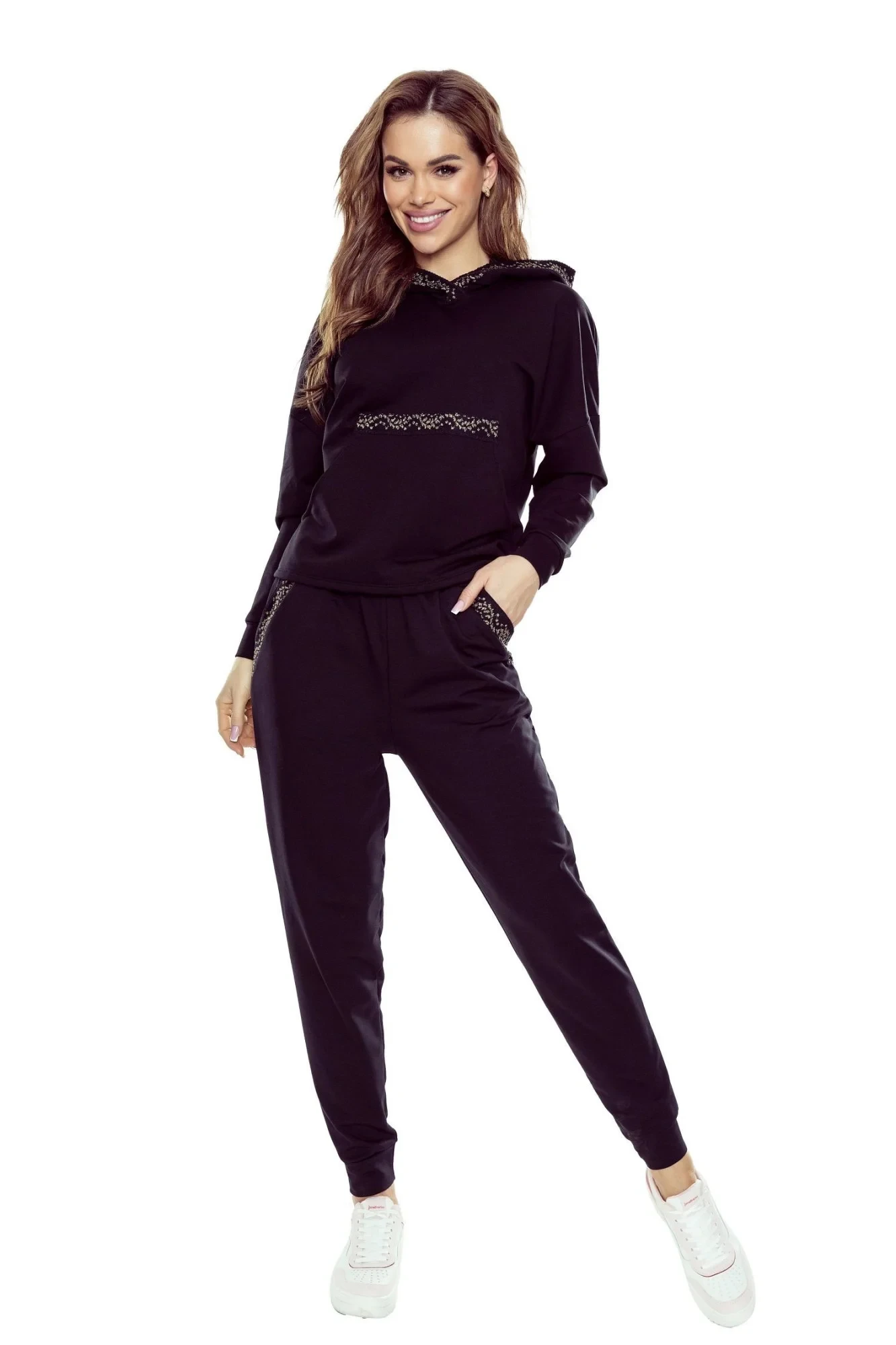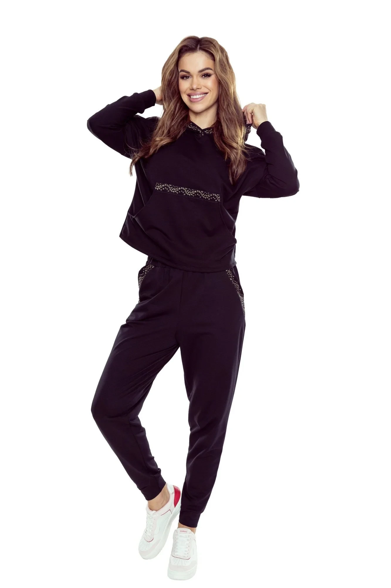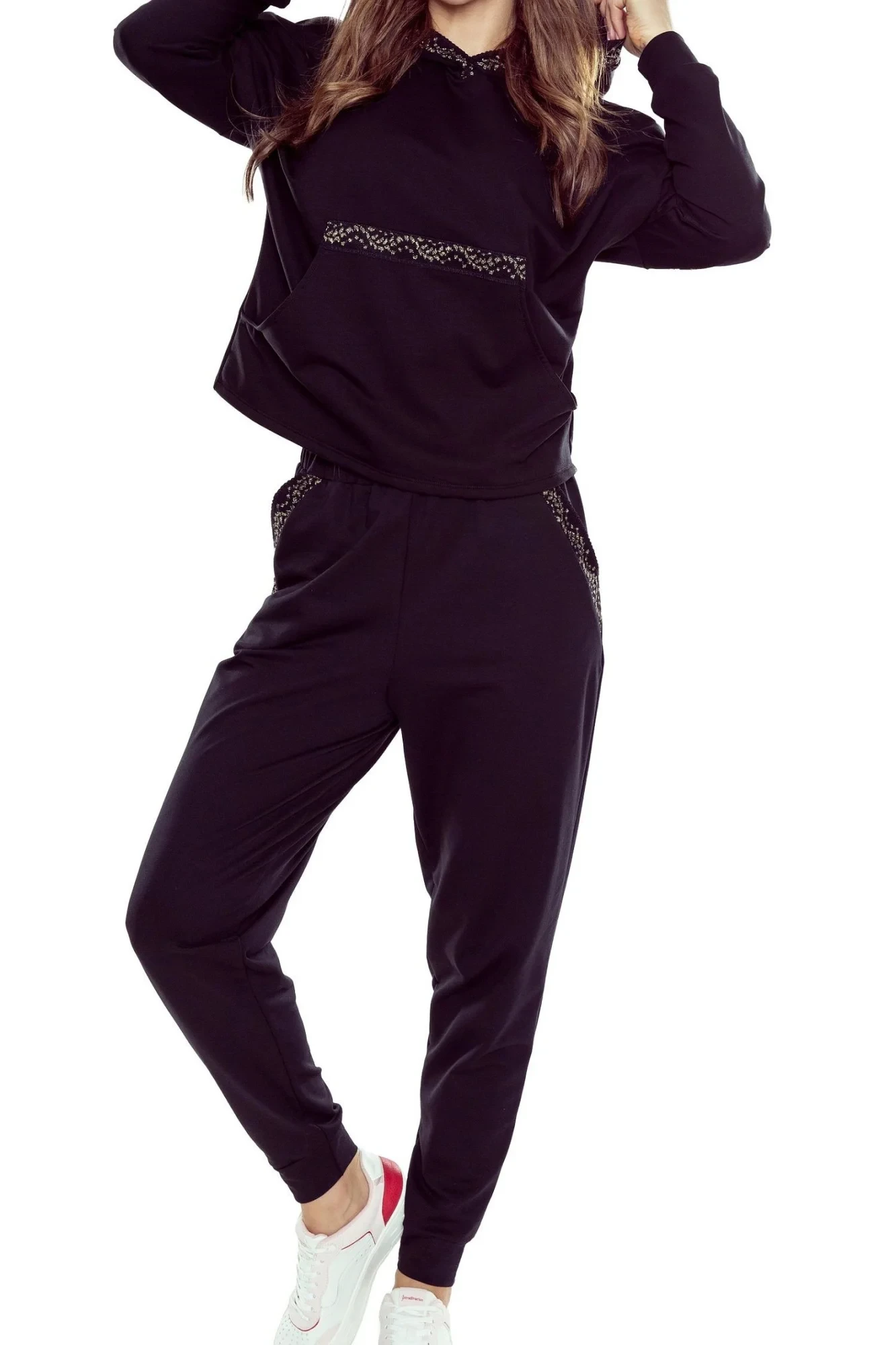 Dámská tepláková souprava Ferbi black ELDAR - černá barva - z tenké teplákoviny - mikina s kapucí - dlouhé volné kalhoty zúžené směrem dolů - kapuce a kapsy zakončené krajkou s jemnou zlatou nití