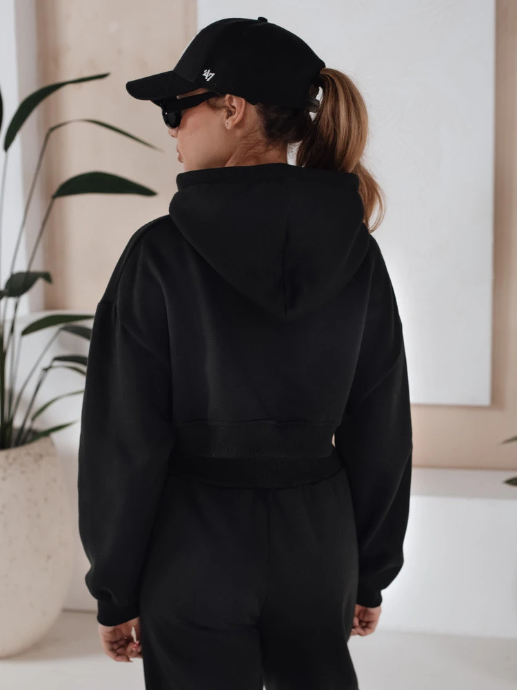 Krátce střižený top s dlouhými rukávy a kapucí je ideální volbou jako základ pro každodenní sportovní oblečení, zatímco kalhoty s vysokým pasem mají přední kapsy, šňůrku v pase a stahovací pásek a budou vypadat skvěle se sportovní obuví.