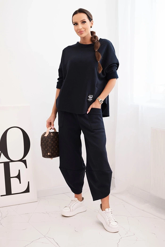 Set se hodí jak na každodenní nošení, k relaxaci doma, tak na procházky nebo nákupy. Charakteristické velké kapsy na kalhotách a snížený krok mu dodávají moderní, streetwearový charakter. Mikina s kulatým výstřihem a spadlými rameny odpovídá aktuálním módním trendům.