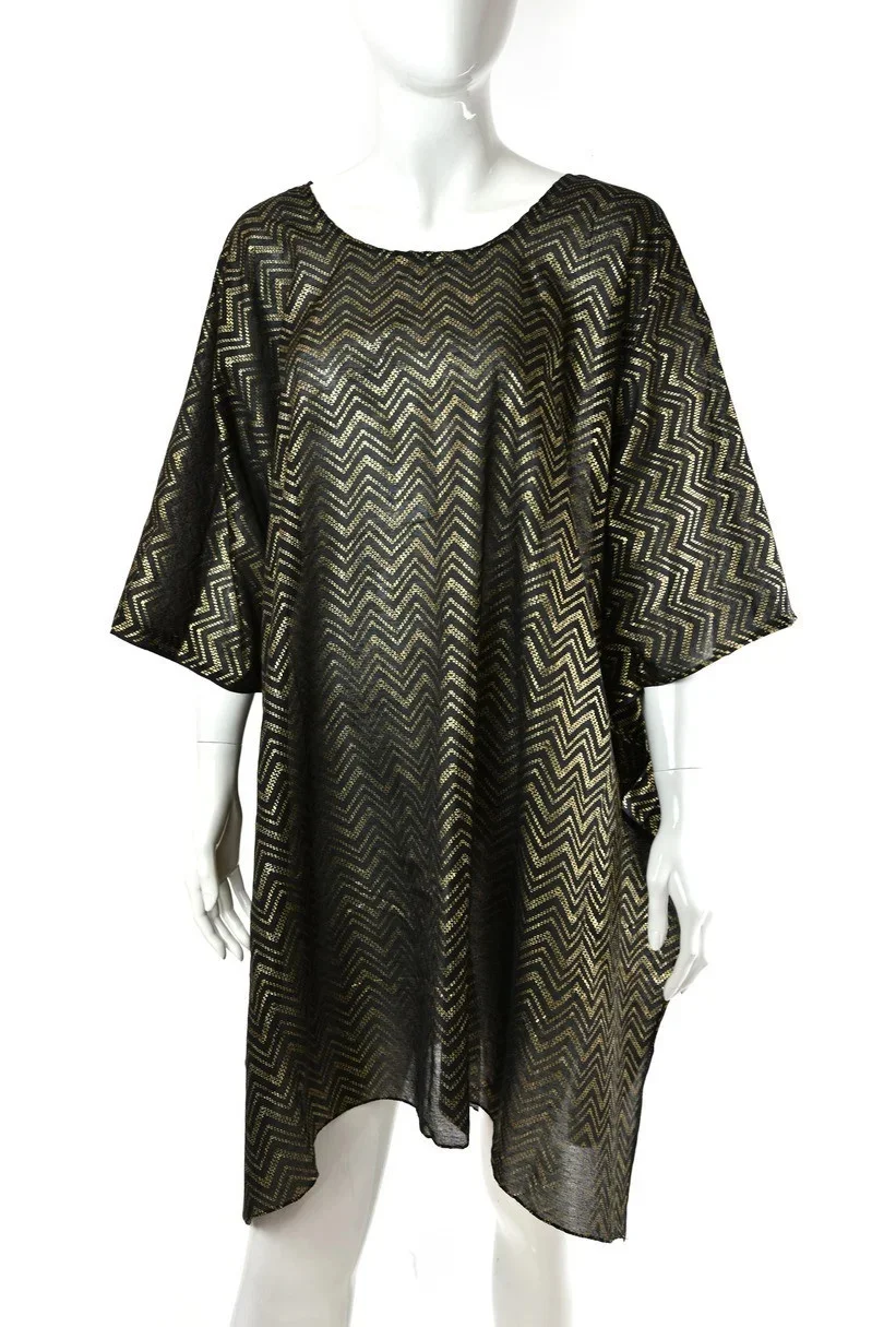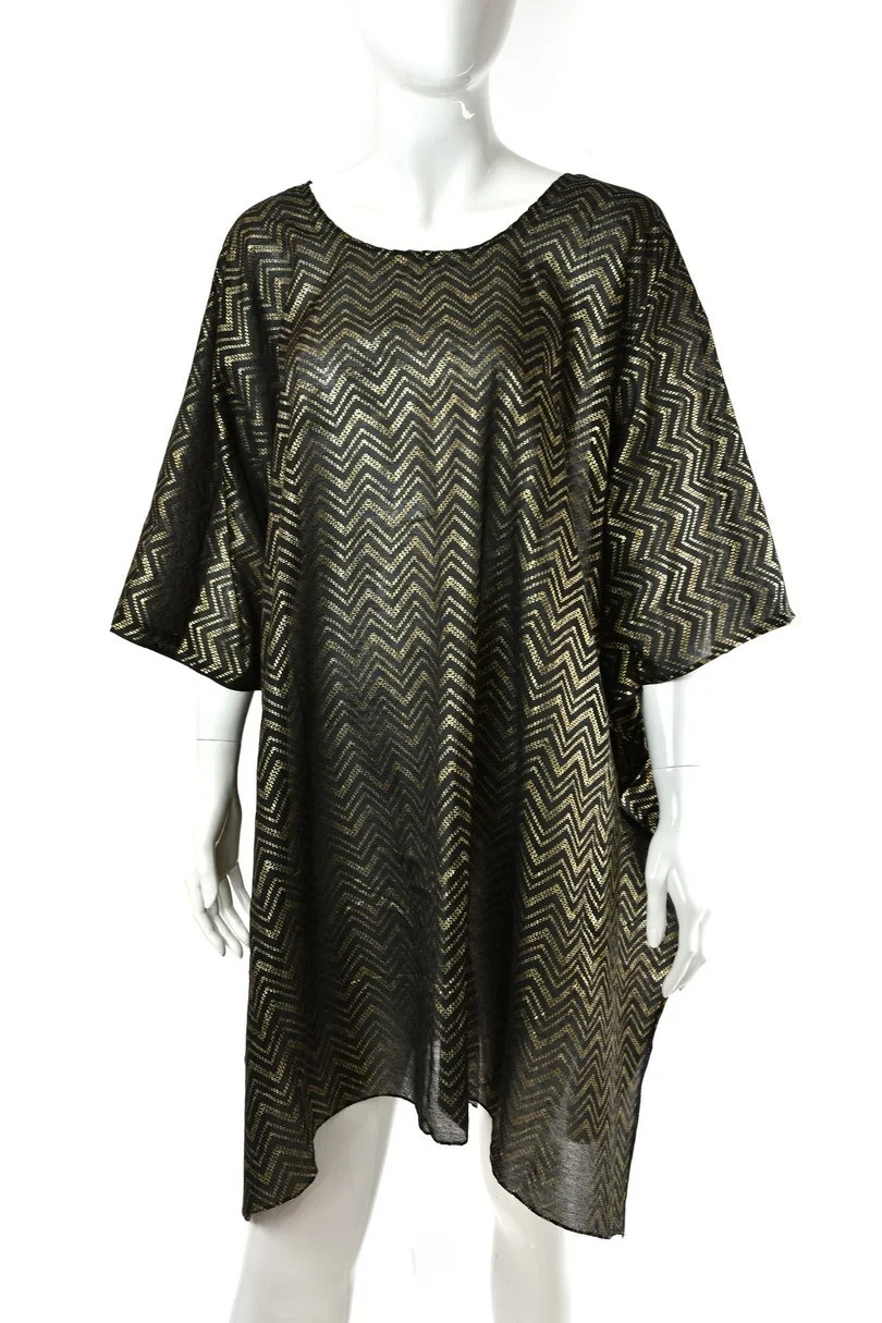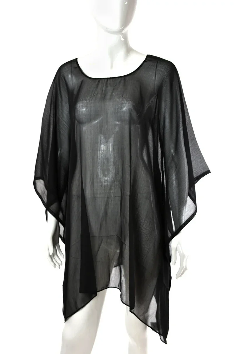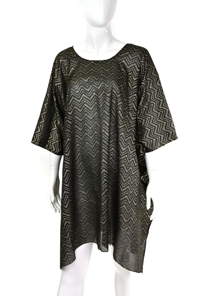 Tunika má volný a pohodlný střih, velký výstřih a asymetrickou spodní část. Model ideálně doplní oblečení na pláž.