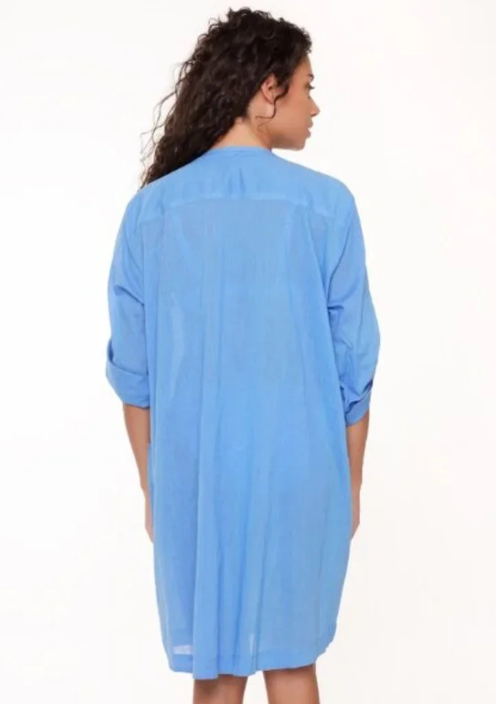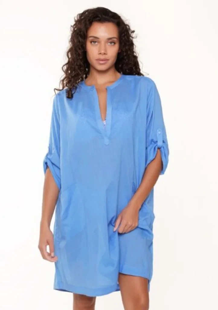 Dámská tunika značky LingaDore. Tunika je poloprůsvitná, vhodná na pláž i k bazénu. Materiál je velmi prodyšný, ze 100% bavlny. Volná tunika má 3/4 rukávy s možností zahnutí a upevnění na knoflík. Tunika má délku po kolena a výstřih do tvaru V s prošívaným lemováním. V přední části jsou po stranách našity kapsy.