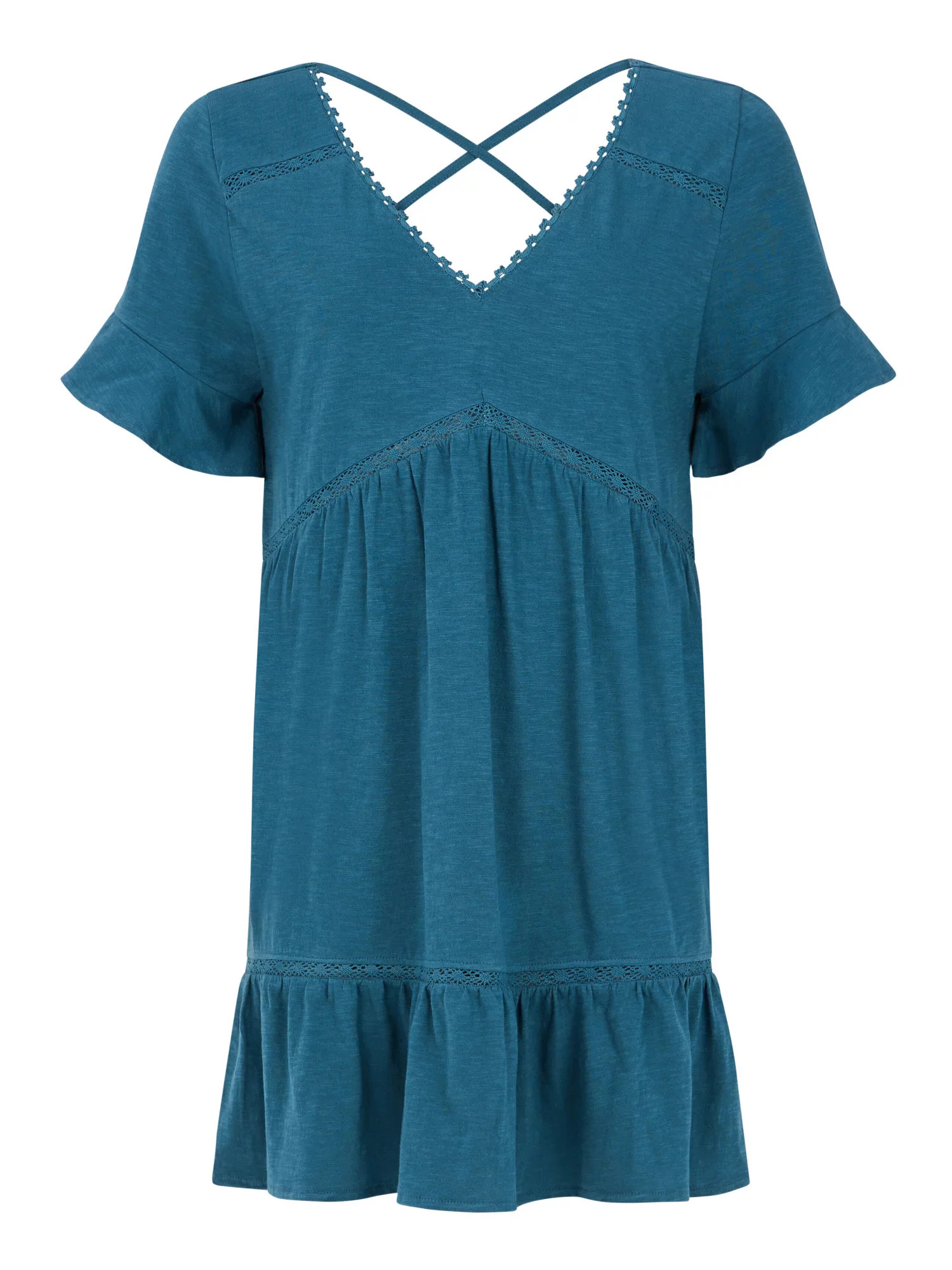 Překřížená ramínka vzadu dodávají klasickému designu tuniky stylový šmrnc.