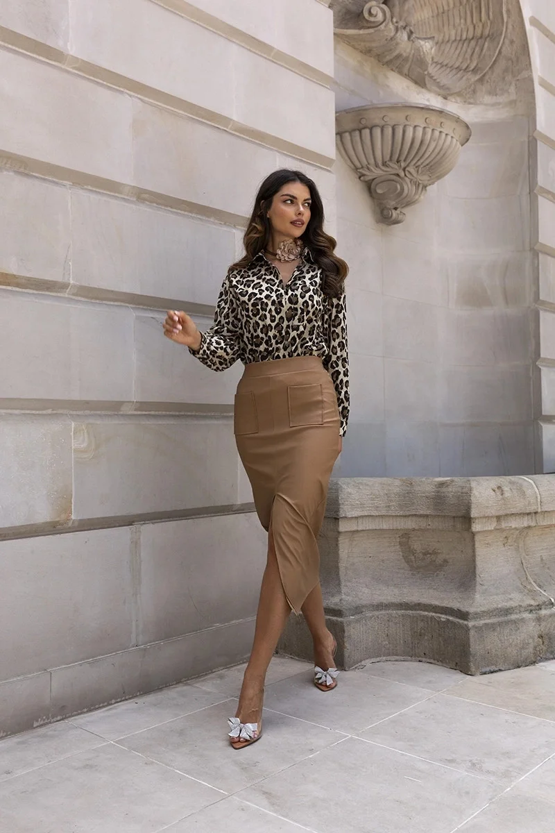 Přidání recenze k Dámská tužková pouzdrová sukně ve velbloudí barvě z eko kůže (82104)