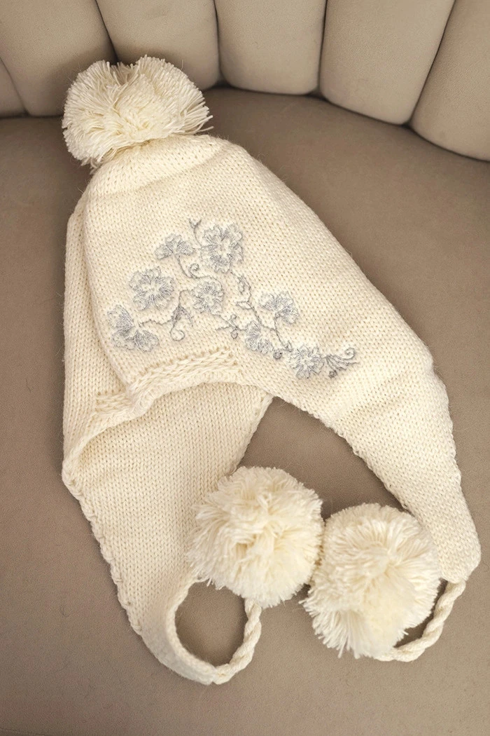 Teplá a stylová čepice s ušima a roztomilými bambulkami, se subtilním vyšívaným vzorem. Model ideální na zimní dny – zajišťuje pohodlí, chrání uši před větrem a přitahuje pozornost originálním designem.