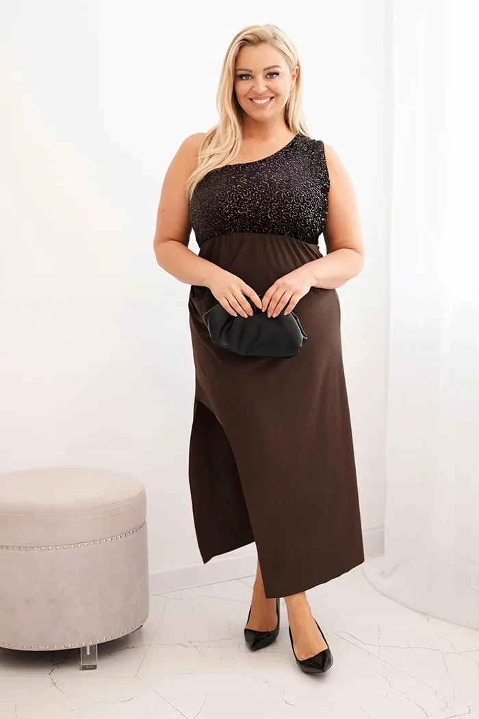 Elegantní a ženské večerní šaty na jedno rameno jsou ideálním návrhem na výjimečné příležitosti, jako jsou svatby, bankety nebo elegantní večeře. Vrchní část šatů je ozdobena lesklými flitry, které dodávají lesk a přitahují pohledy, zatímco spodní část vyrobená z splývavého materiálu se krásně pohybuje a podtrhuje siluetu.