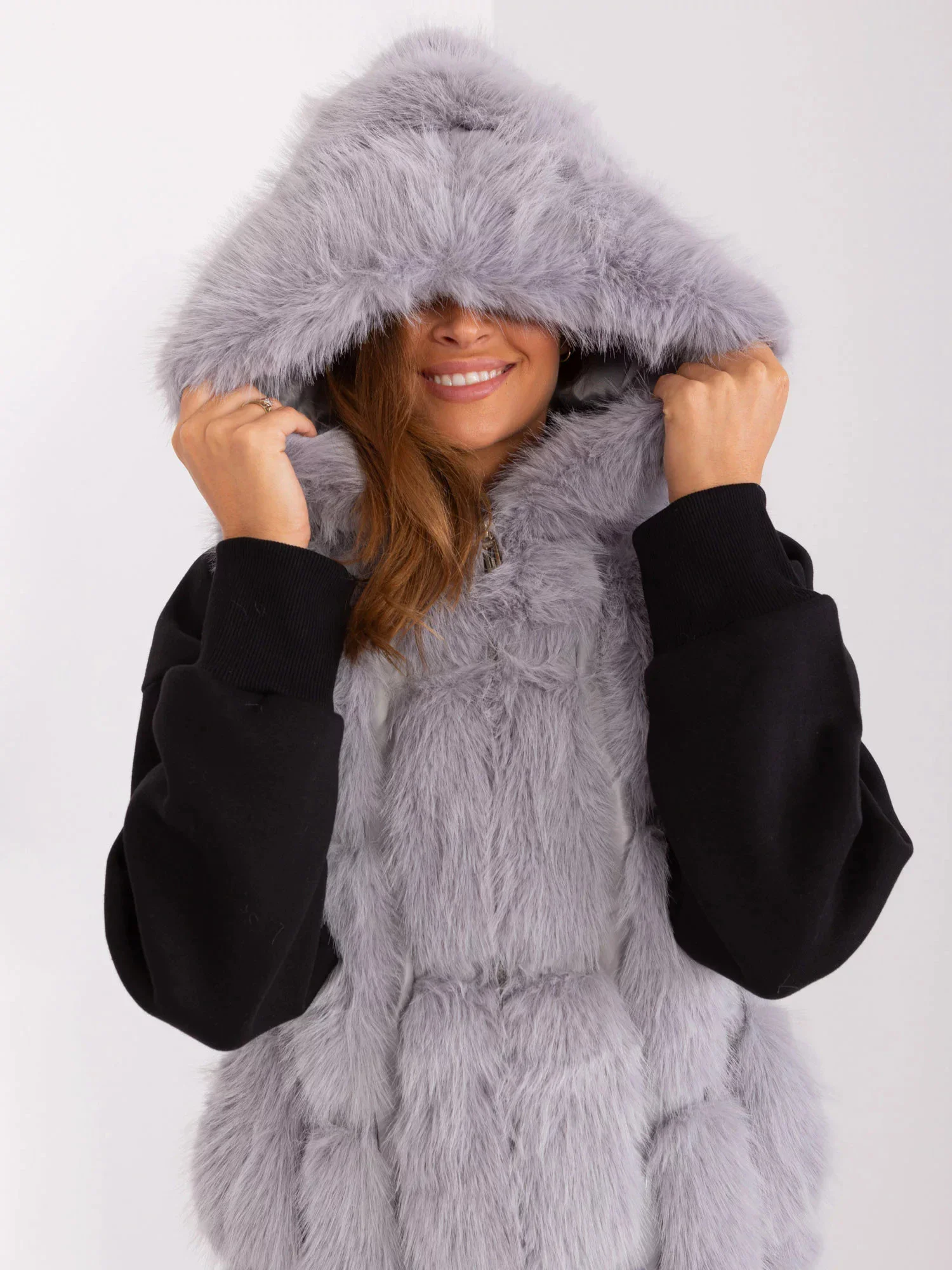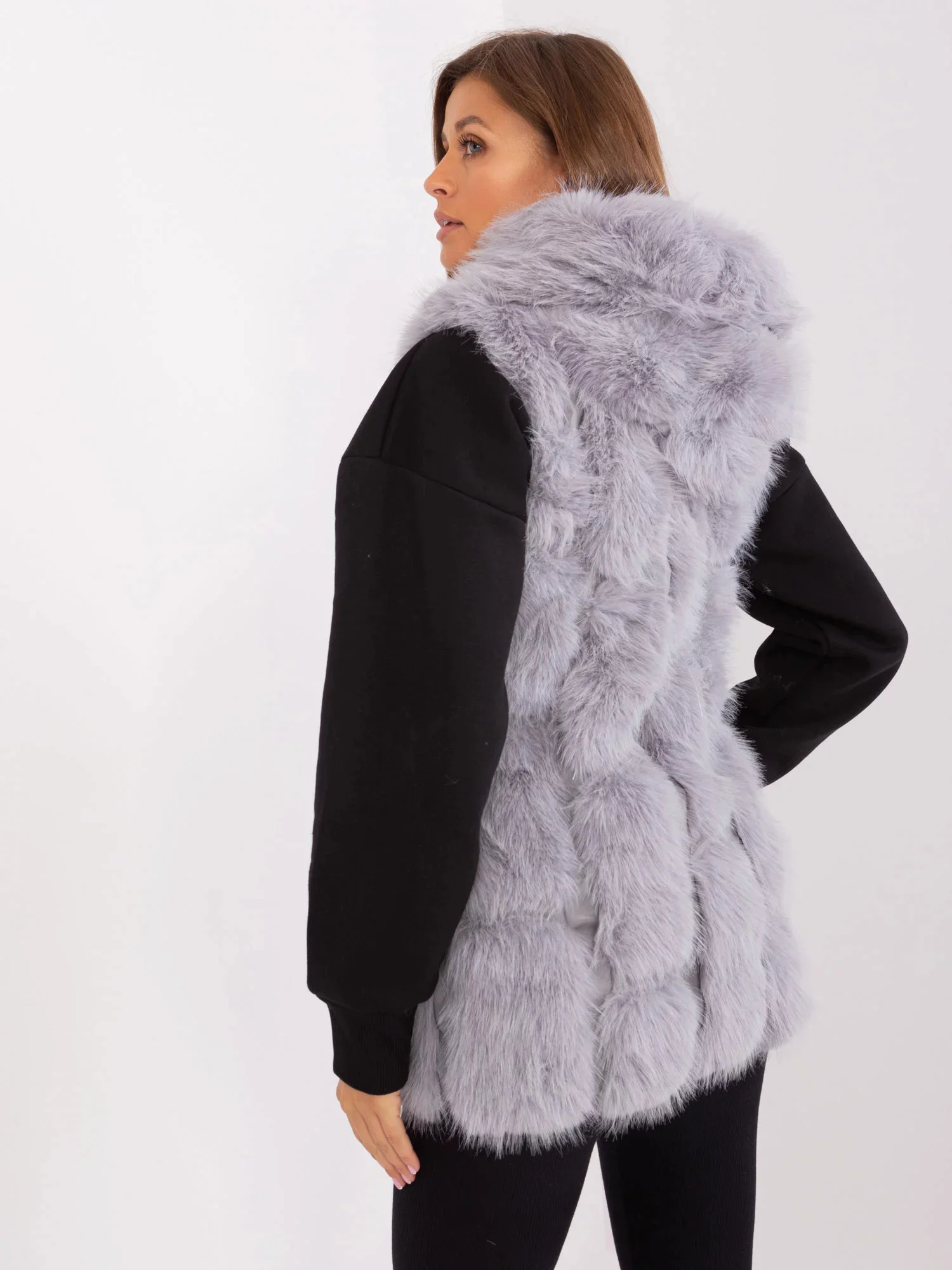 Šedá rozepínací vesta z organické kožešiny.