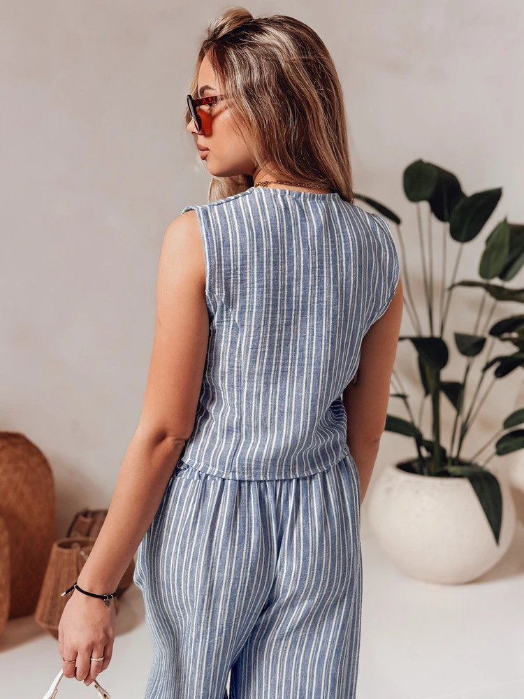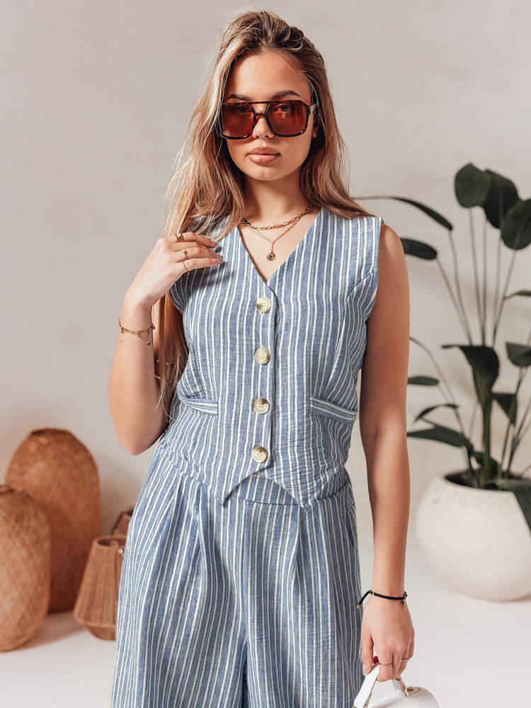 Tato letní vesta, která je ideální volbou pro teplejší dny, je univerzální model pro pohodlí a volnost pohybu. Zapíná se vpředu na ozdobné knoflíky, má elegantní výstřih do V a látkové pruhy na bocích, které zdůrazňují její ležérní, prázdninový charakter. Univerzální velikost je vhodná pro velikosti od XS do L. Je vyrobena z lehkého, prodyšného materiálu, který je ideální pro horké dny.