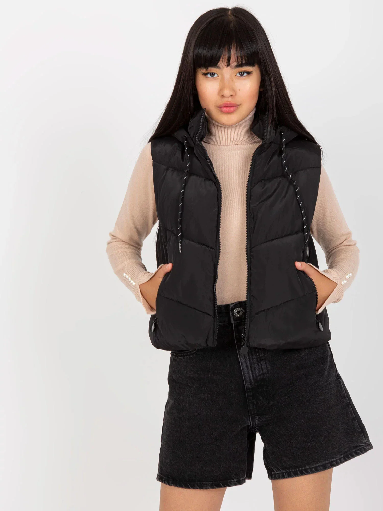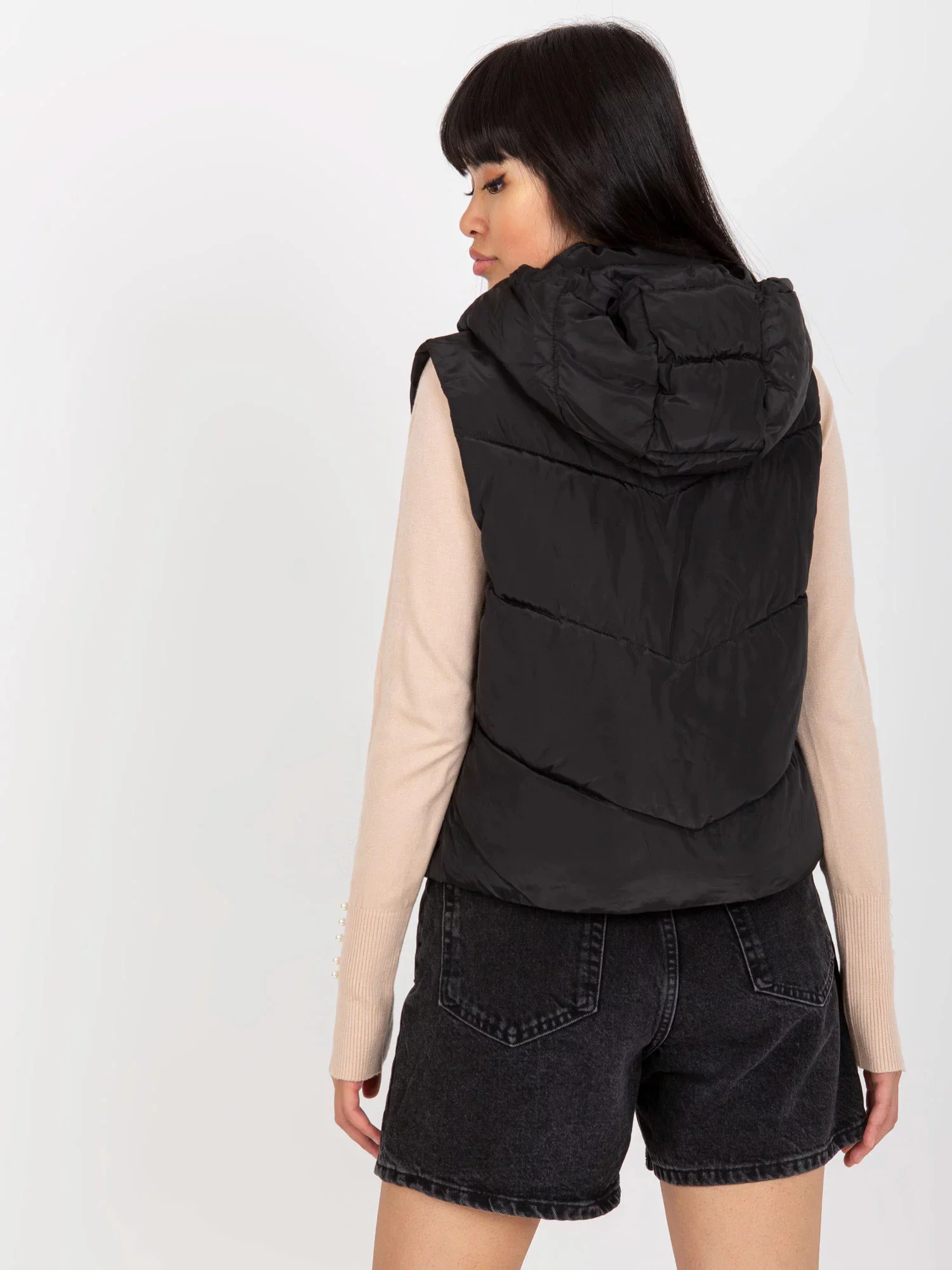 Černá krátká péřová vesta s prošíváním .