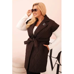 Stylová, prošívaná dámská vesta s páskem je nabídkou pro ženy, které si cení eleganci spojenou s pohodlím. Model s klasickým límcem a dekorativní broží „D” krásně zvýrazňuje siluetu díky přiloženému pásku, který lze regulovat v pase. Prošívaný materiál s geometrickým vzorem dodává celku moderní charakter a délka po kolena zajišťuje ochranu a komfort v chladnějších dnech.