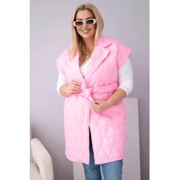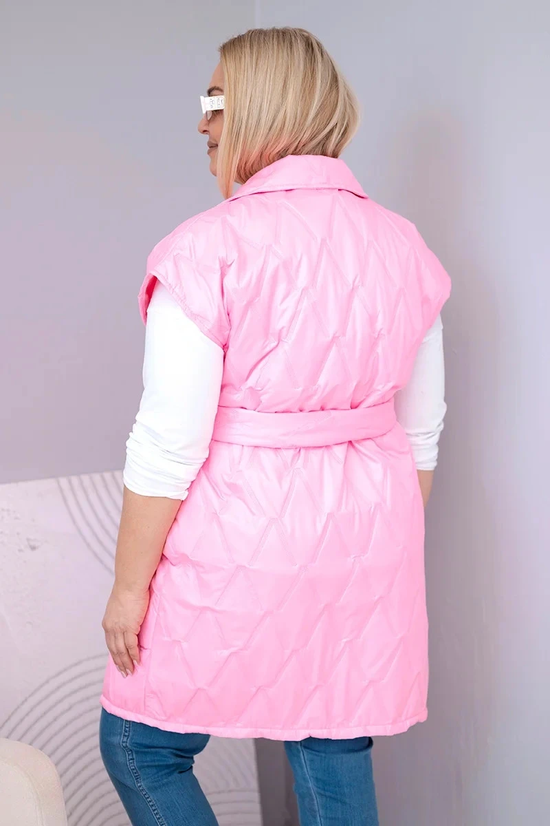 Stylová, prošívaná dámská vesta s páskem je nabídkou pro ženy, které si cení eleganci spojenou s pohodlím. Model s klasickým límcem a dekorativní broží „D” krásně zvýrazňuje siluetu díky přiloženému pásku, který lze regulovat v pase. Prošívaný materiál s geometrickým vzorem dodává celku moderní charakter a délka po kolena zajišťuje ochranu a komfort v chladnějších dnech.
