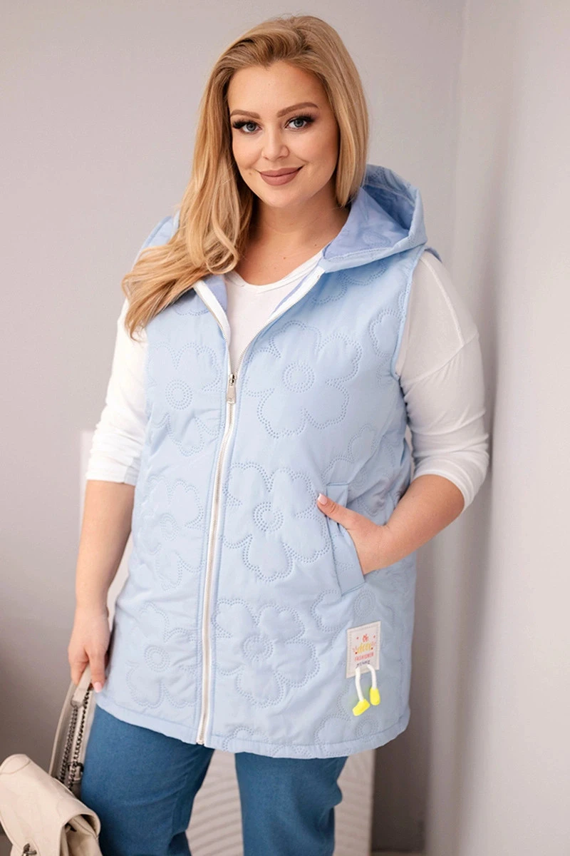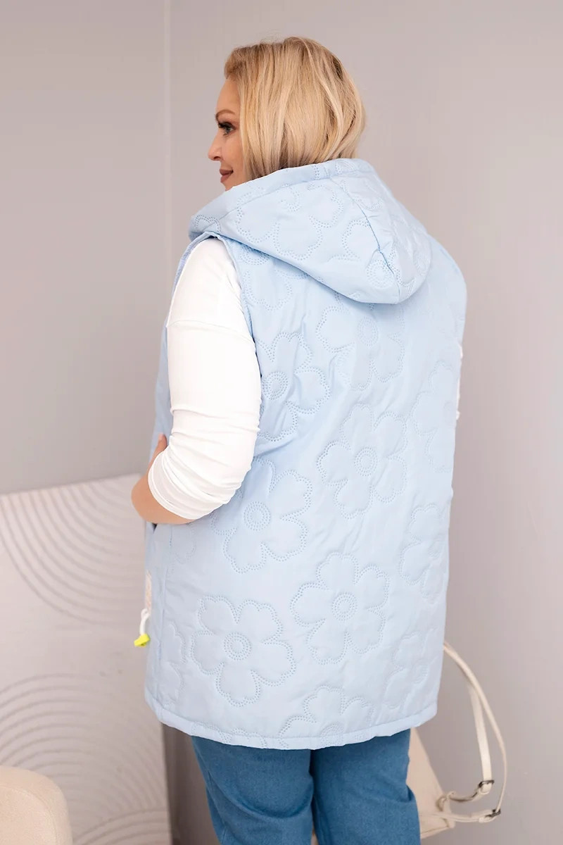 Dámská vesta Plus Size s kapucí a květinovým prošíváním modrá