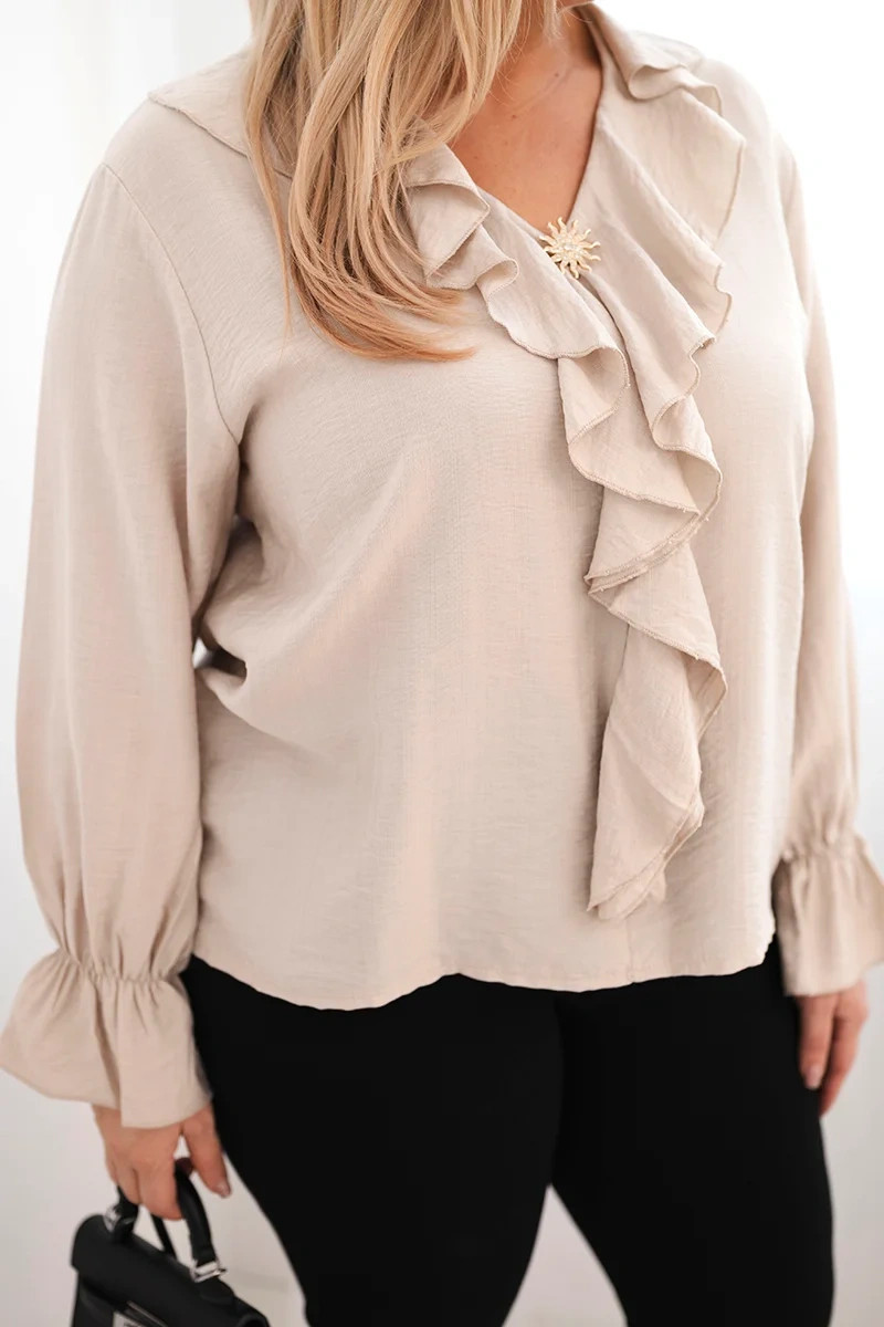 Dámská viskózová blůza Plus Size s volánem a ozdobnou broží béžová