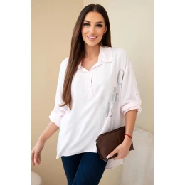 Zapínání na knoflíky a možnost ohrnutí rukávů zajišťují, že blůza je velmi funkční a přizpůsobí se různým příležitostem – skvělá k nohavicím, legínám nebo sukni. Drobné zdobení s kamínky dodává eleganci a originalitu.
