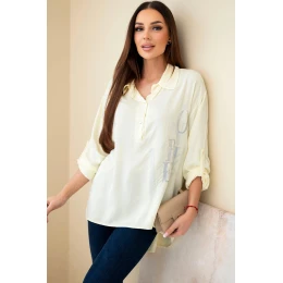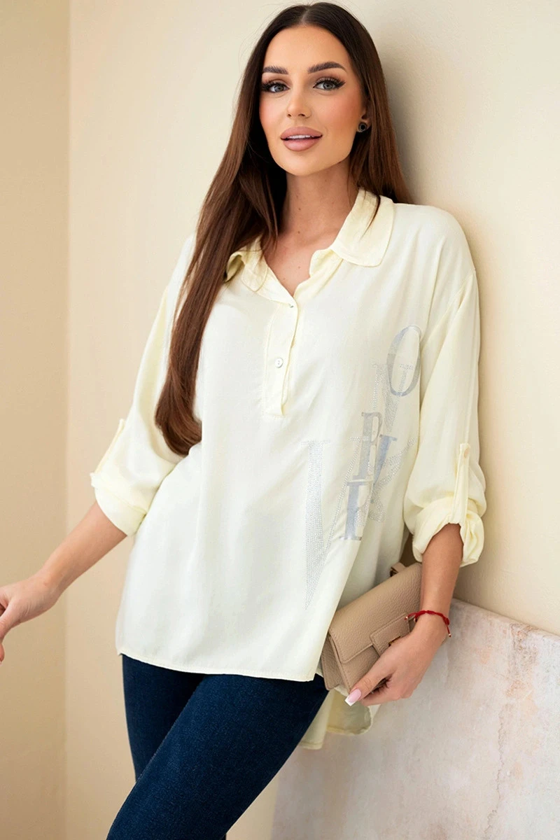 Dámská viskózová blůza s límečkem a potiskem s krystaly žlutá