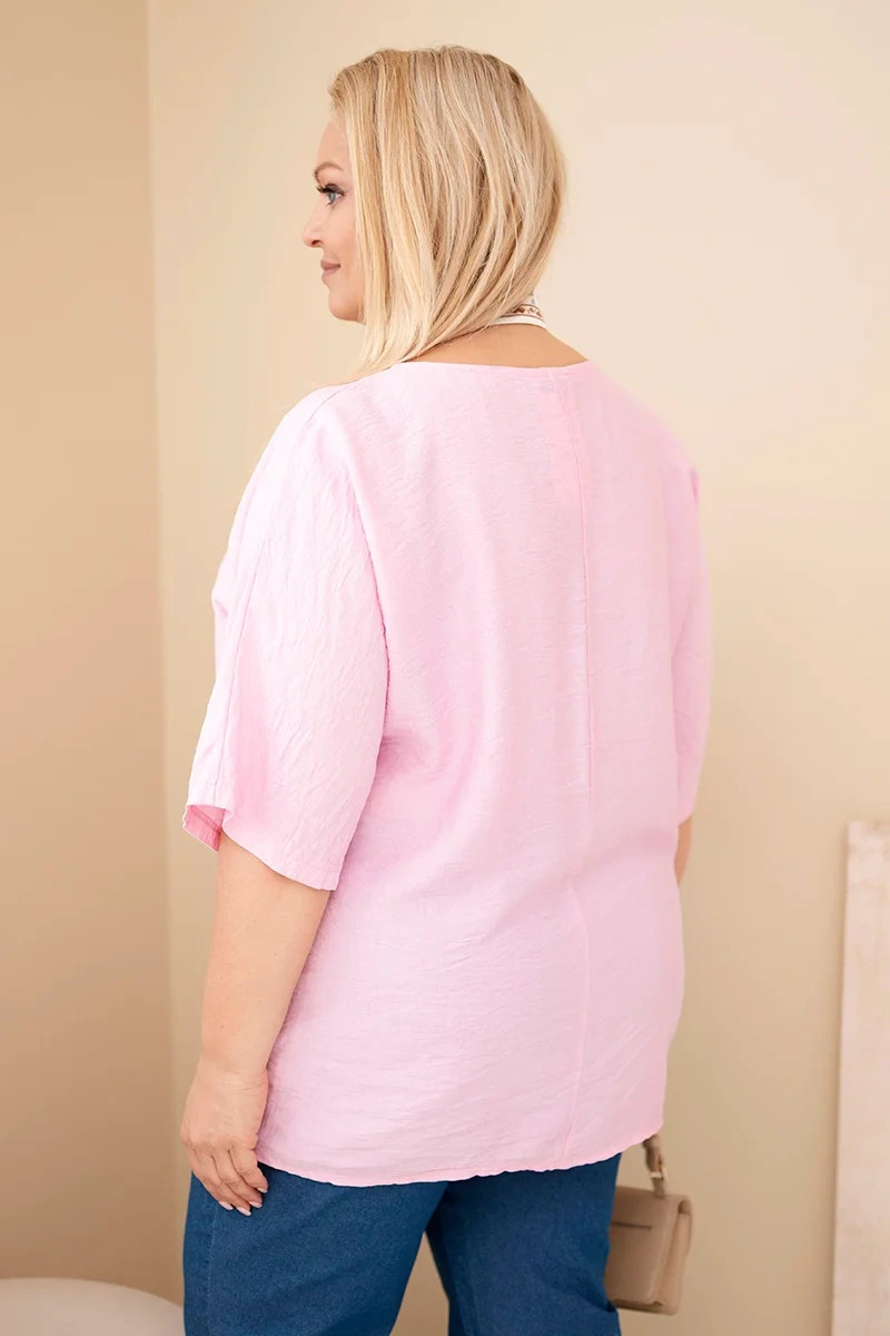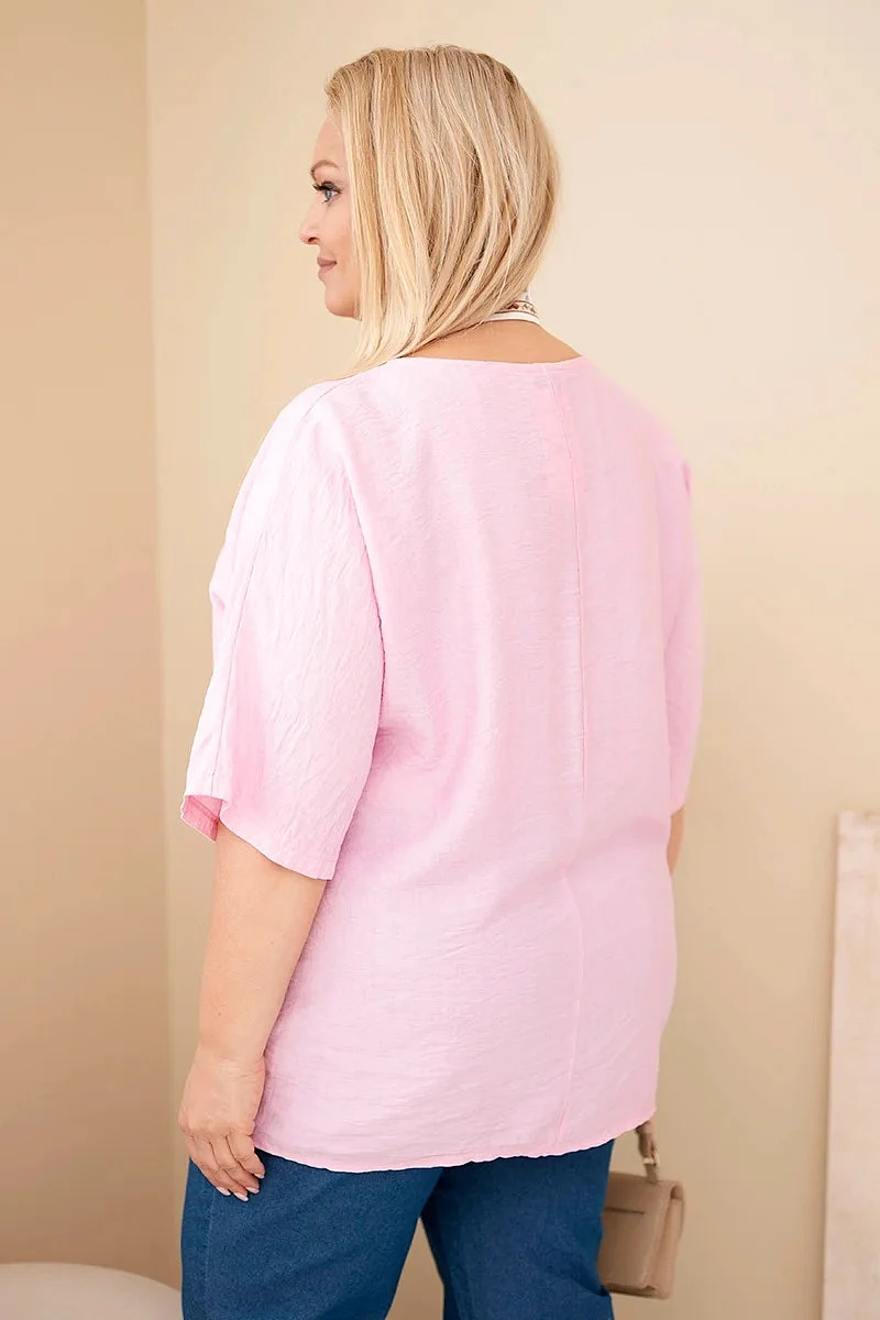 Dámská viskózová halenka Plus Size s krátkým rukávem a ozdobným šátkem bonbónově růžová