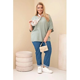 Dámská viskózová halenka Plus Size s krátkým rukávem a ozdobným šátkem khaki