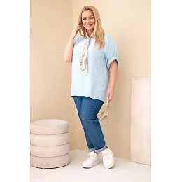 Dámská viskózová halenka Plus Size s krátkým rukávem a ozdobným šátkem modrá