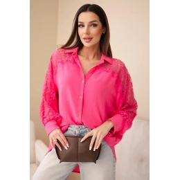 Stylová dámská košile s elegantním límečkem a jemným zapínáním na knoflíky je ideální volbou pro ženy, které si cení třídy a pohodlí v každodenním stylu. Model se vyznačuje efektními krajkovými rukávy a rameny, které dávají celku výjimečný charakter. Volný střih zajišťuje volnost pohybu a komfort nošení po celý den.