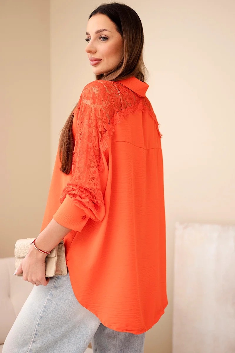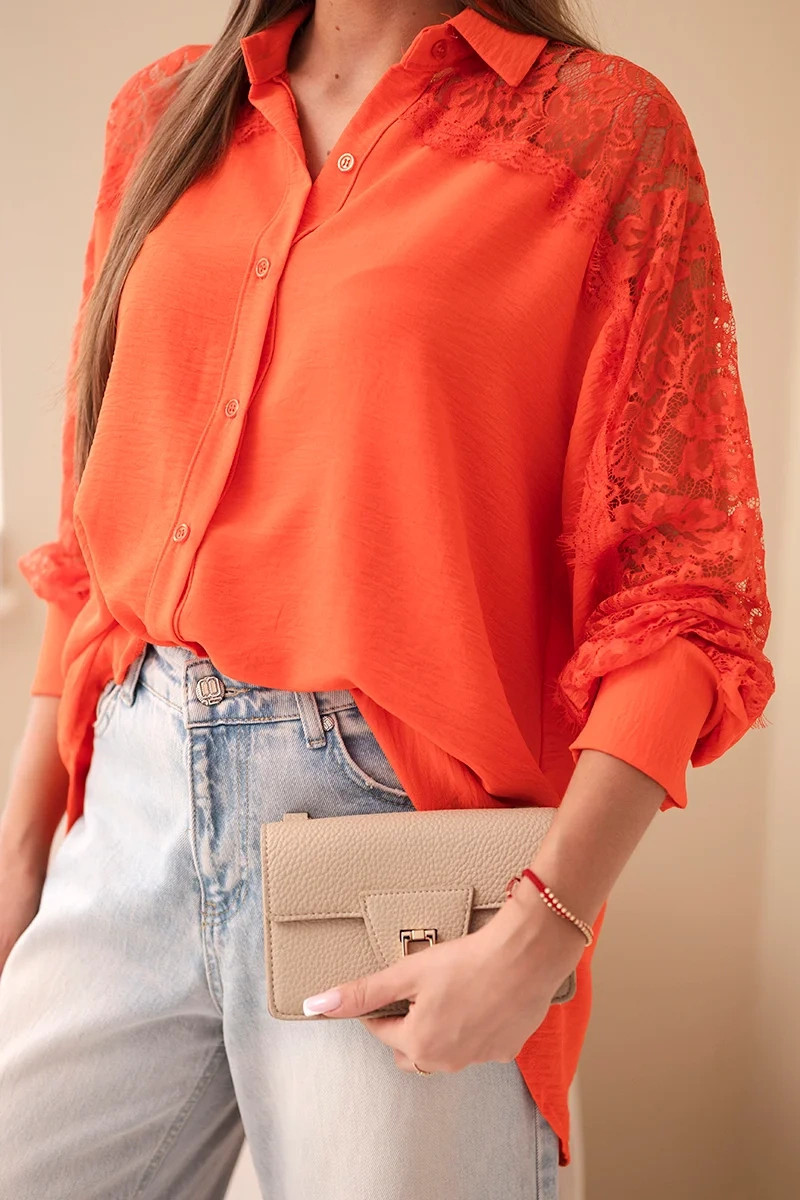Stylová dámská košile s elegantním límečkem a jemným zapínáním na knoflíky je ideální volbou pro ženy, které si cení třídy a pohodlí v každodenním stylu. Model se vyznačuje efektními krajkovými rukávy a rameny, které dávají celku výjimečný charakter. Volný střih zajišťuje volnost pohybu a komfort nošení po celý den.