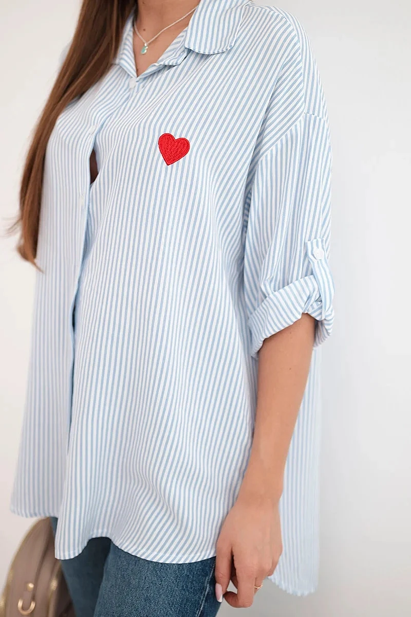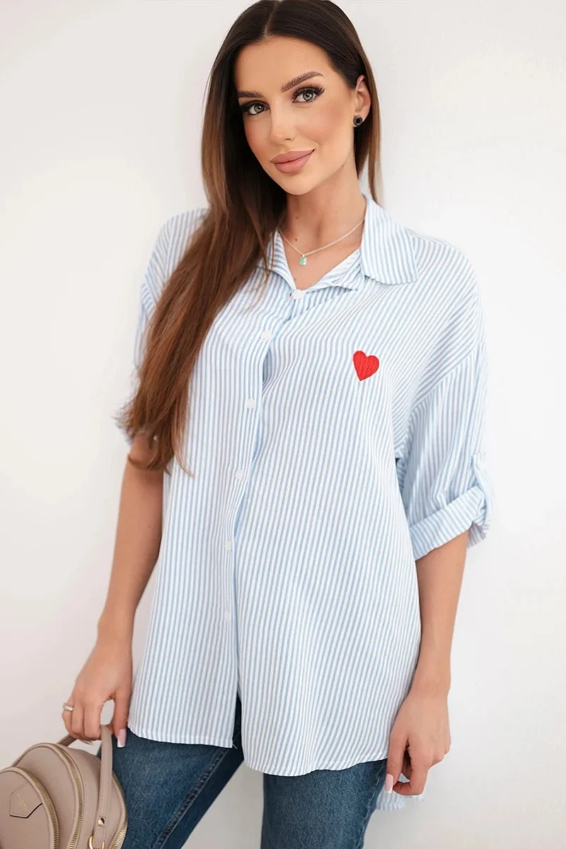Tato dámská košile je ideální kombinací klasiky a dívčího kouzla! Vyrobena z vysoce kvalitní bavlny s přídavkem elastanu, zajišťuje nejen pohodlí při nošení, ale také krásné padnutí na postavě. Subtilní pruhovaný vzor a vyšívané červené srdíčko na prsou jí dodávají originalitu a lehkost.
