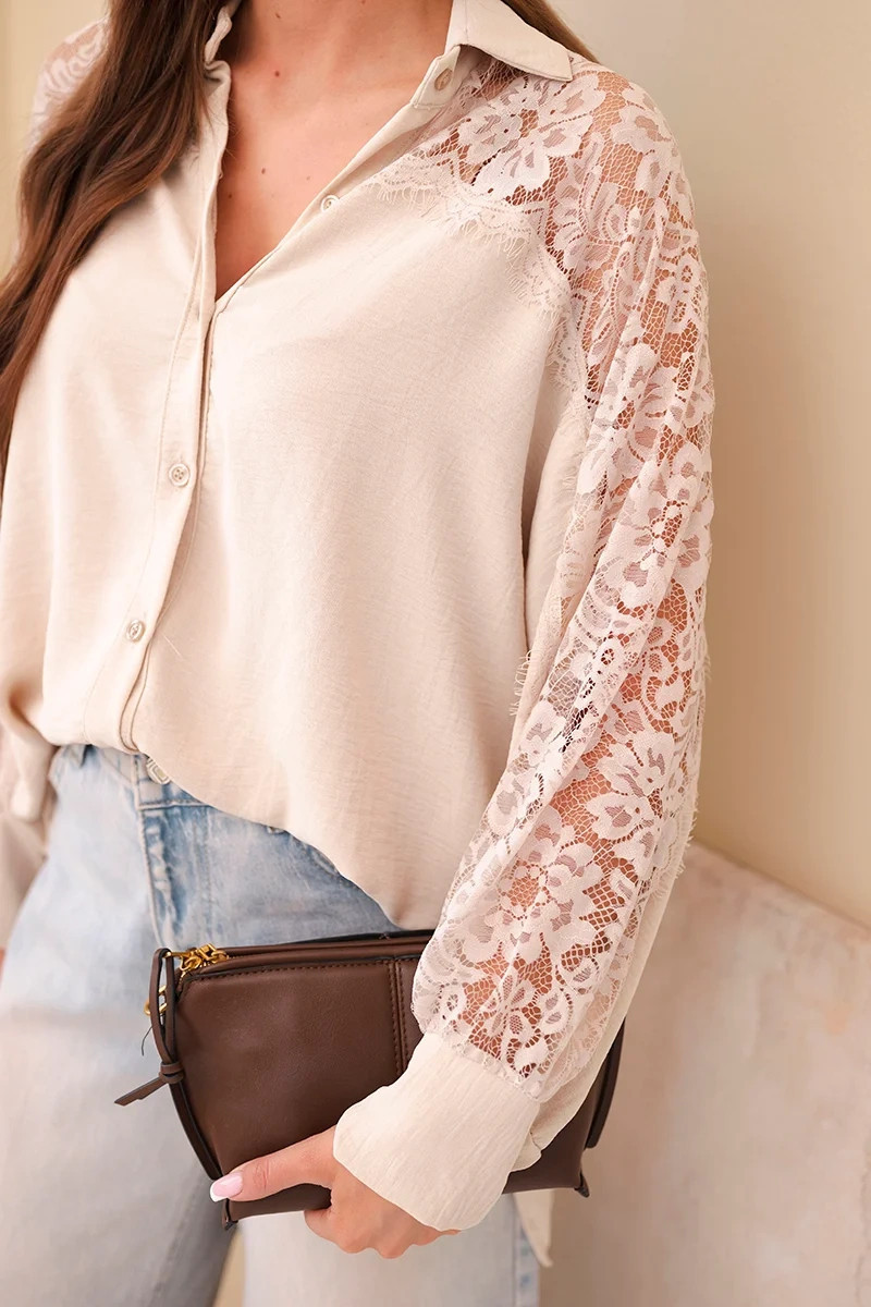Dámská viskózová košile s krajkovými rukávy a límečkem béžová
