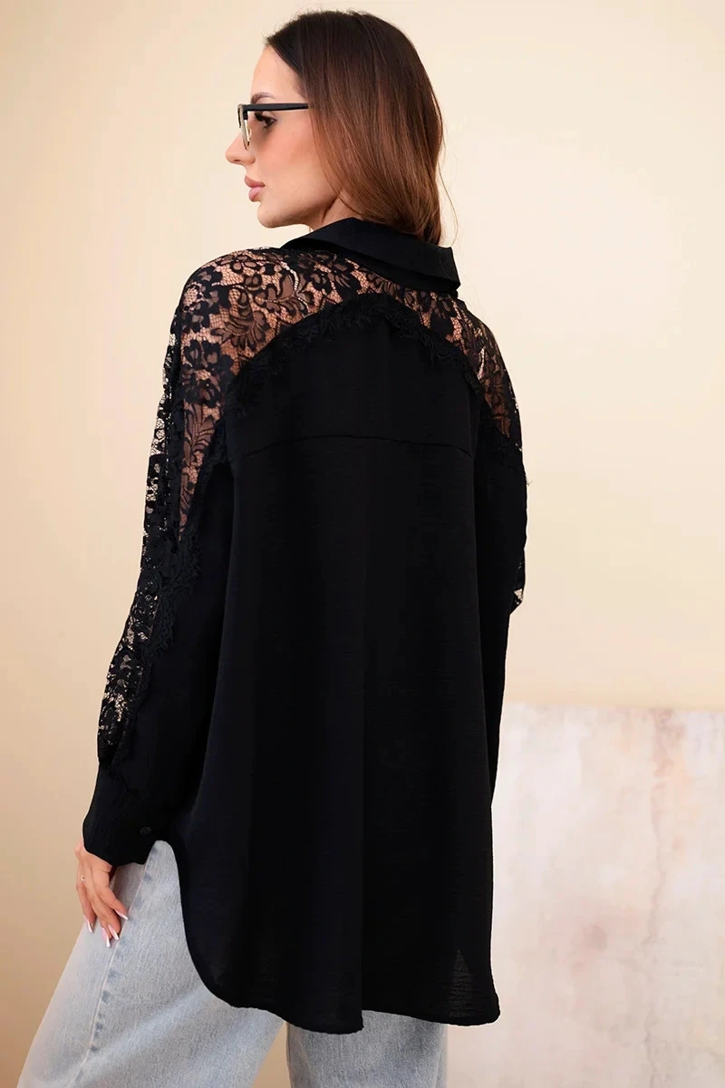 Dámská viskózová košile s krajkovými rukávy a límečkem černá