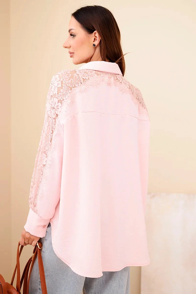 Dámská viskózová košile s krajkovými rukávy a límečkem pudrově růžová