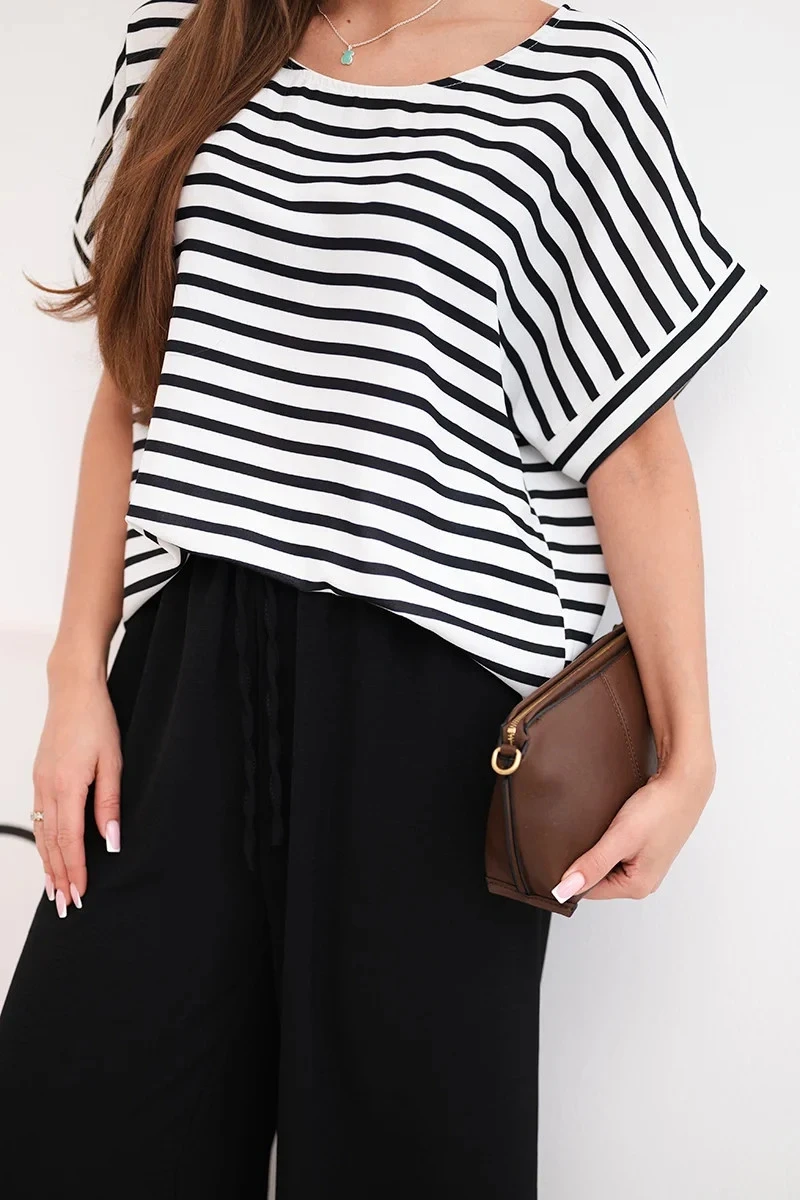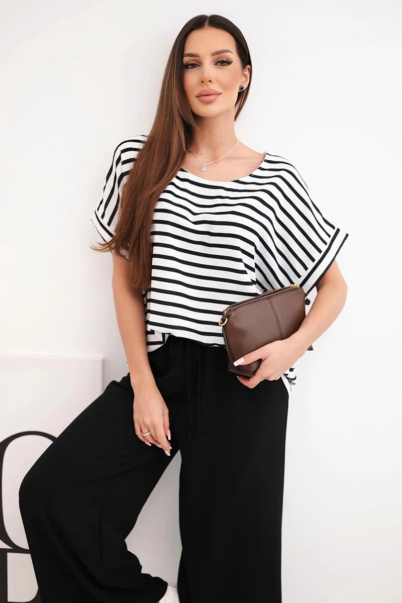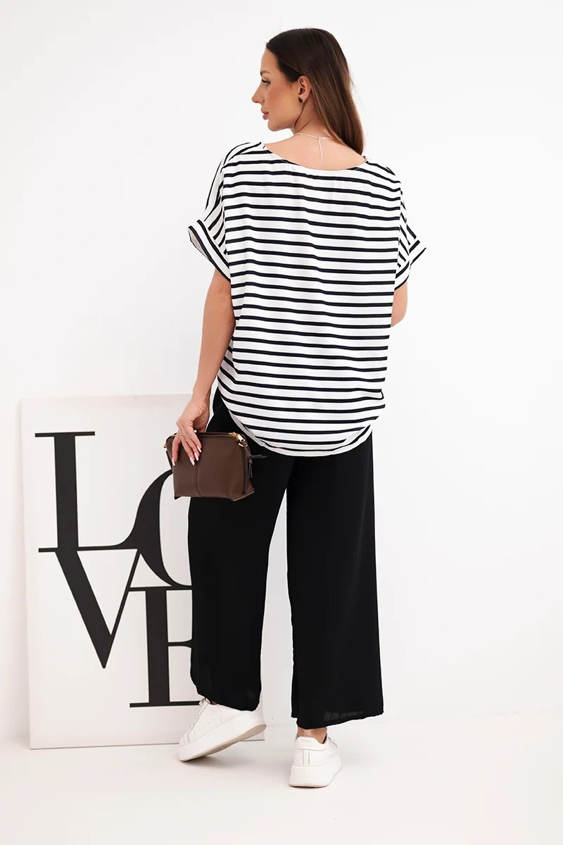 Vnes do svého šatníku nádech svěžesti díky tomuto stylovému dámskému setu! Tričko s krátkým rukávem v jemných pruzích a široké, splývavé kalhoty jsou ideální kombinací pohodlí a módního vzhledu. Set se skvěle hodí jak na procházku, do práce, tak na letní výlet. Lehce splývavá tkanina se dokonale přizpůsobuje postavě, zajišťuje volnost pohybu po celý den. Elastický pas v kalhotách zaručuje pohodlí a přizpůsobení postavě.