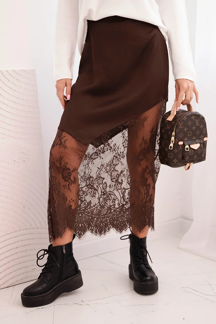 Stylová a mimořádně ženská dámská saténová sukně s krajkou je ideální nabídkou pro milovnice elegantního a zároveň pohodlného stylu. Vyrobená z jemně lesklé viskózy, přitahuje pozornost subtilním leskem a efektním zakončením. Její jedinečný střih s asymetrickým zakončením a spodní částí vyrobenou z ozdobné krajky dodává celku lehkost a romantický charakter.