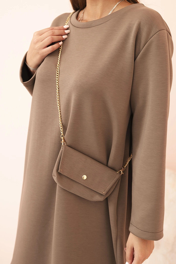 Detaily: taška na zlatém řetízku, dlouhý rukáv, kulatý výstřih