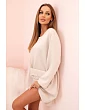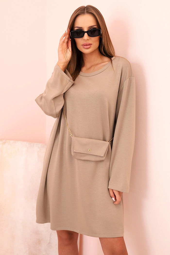 Detaily: taška na zlatém řetízku, dlouhý rukáv, kulatý výstřih