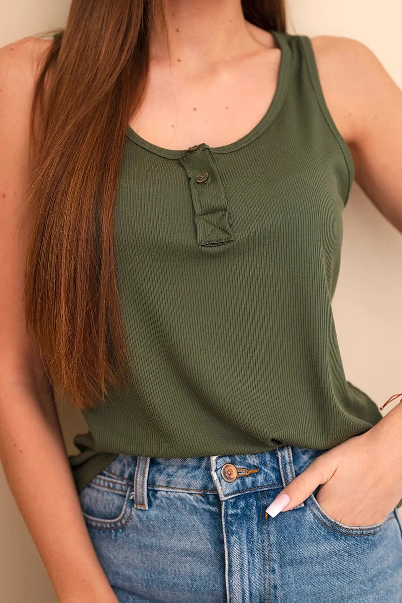Dámská žebrovaná halenka na ramínkách s knoflíkem khaki