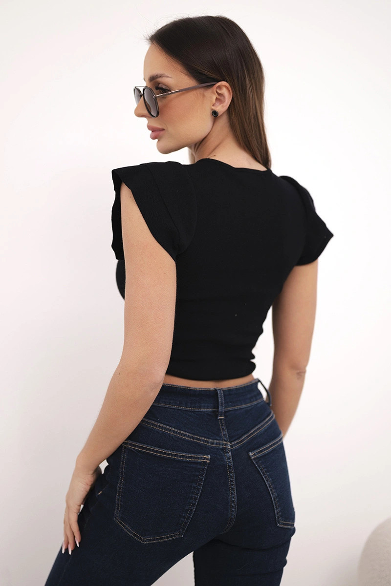 Módní dámská žebrovaná crop halenka s řasením je vynikající volbou pro ženy, které mají rády moderní a ženské styly. Přiléhavý střih krásně zvýrazní postavu a efektní řasení s nastavitelným vázáním vpředu dodává celku výjimečný charakter. Krátký crop střih zaručuje, že halenka skvěle ladí s kalhotami či sukněmi s vysokým pasem.