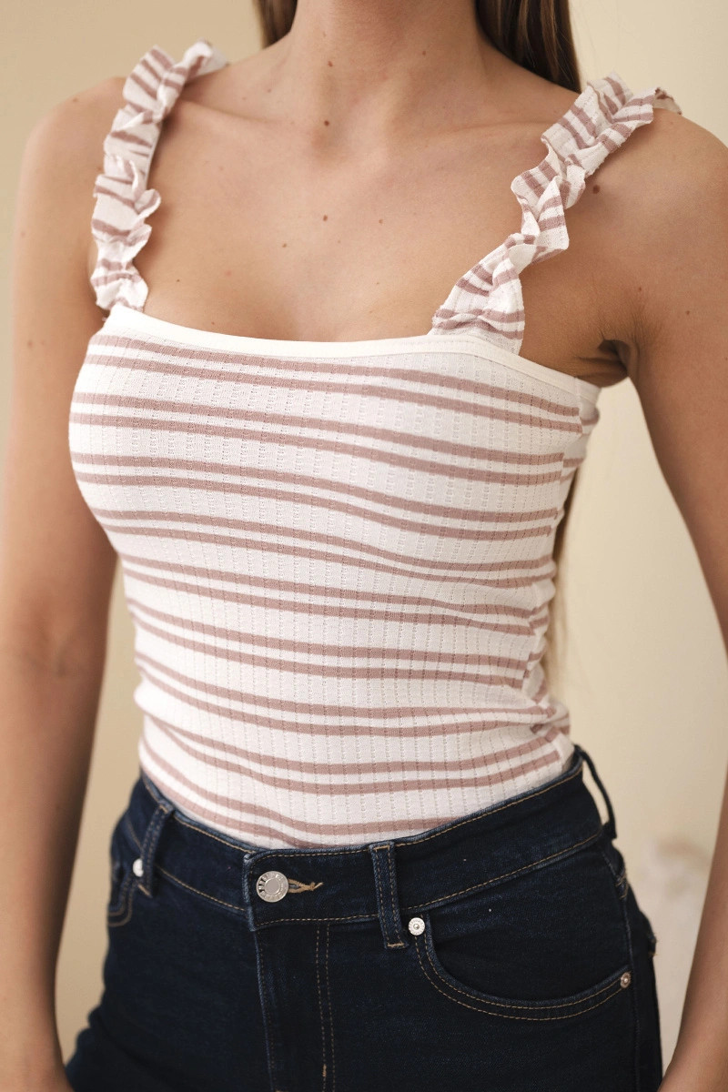 Módní dámská žebrovaná halenka v pruzích na ramínkách je ideální volbou pro teplé dny. Přiléhavý střih krásně zvýrazňuje postavu a jemné volánky na ramínkách dodávají celku ženský a romantický charakter. Proužkovaný vzor dodává halence lehkost a činí z modelu skvělý letní trend.