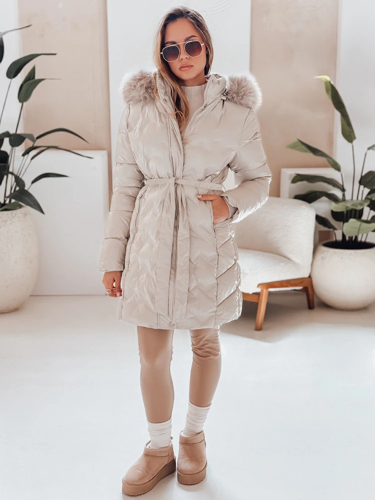 Dlouhá prošívaná zimní bunda s páskem zvýrazňujícím pas a kapucí lemovanou měkkou kožešinou. Poskytuje účinnou ochranu před chladem a větrem a zároveň vypadá stylově a žensky. Ideální pro chladnější dny, pro městský i ležérní styl.