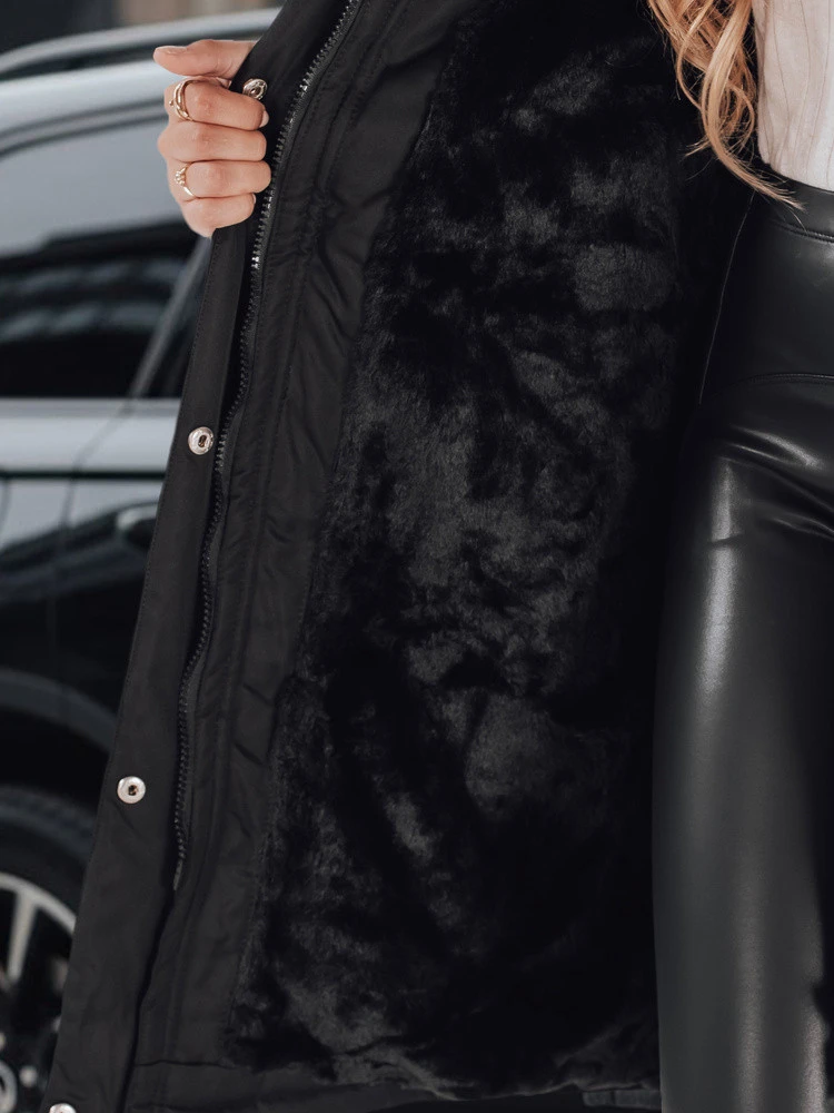 Wnętrze kurtki zostało wykończone miękkim futerkiem, które otula i izoluje przed zimnem. Model łączy funkcjonalność z nowoczesnym stylem, dzięki czemu stanowi doskonałą bazę zimowej garderoby. Idealna do noszenia na co dzień i podczas spacerów w mroźne dni.