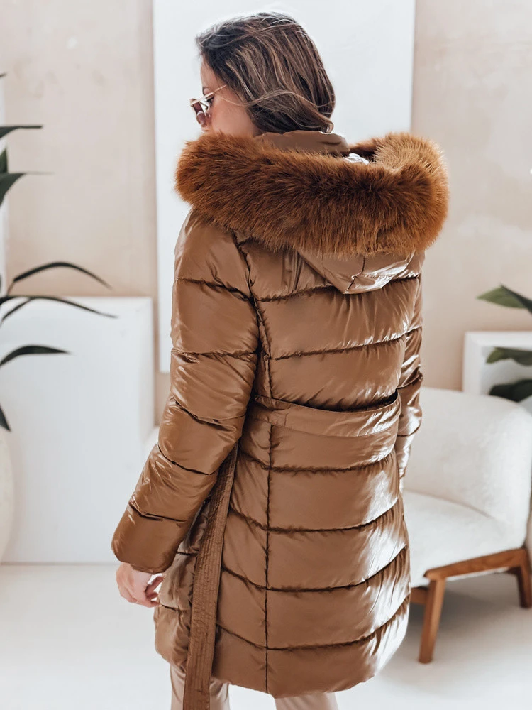 Długa pikowana kurtka zimowa z paskiem podkreślającym talię i kapturem obszytym miękkim futerkiem. Zapewnia skuteczną ochronę przed zimnem i wiatrem, a jednocześnie wygląda stylowo i kobieco. Idealna na chłodniejsze dni, zarówno do miejskich, jak i casualowych stylizacji.