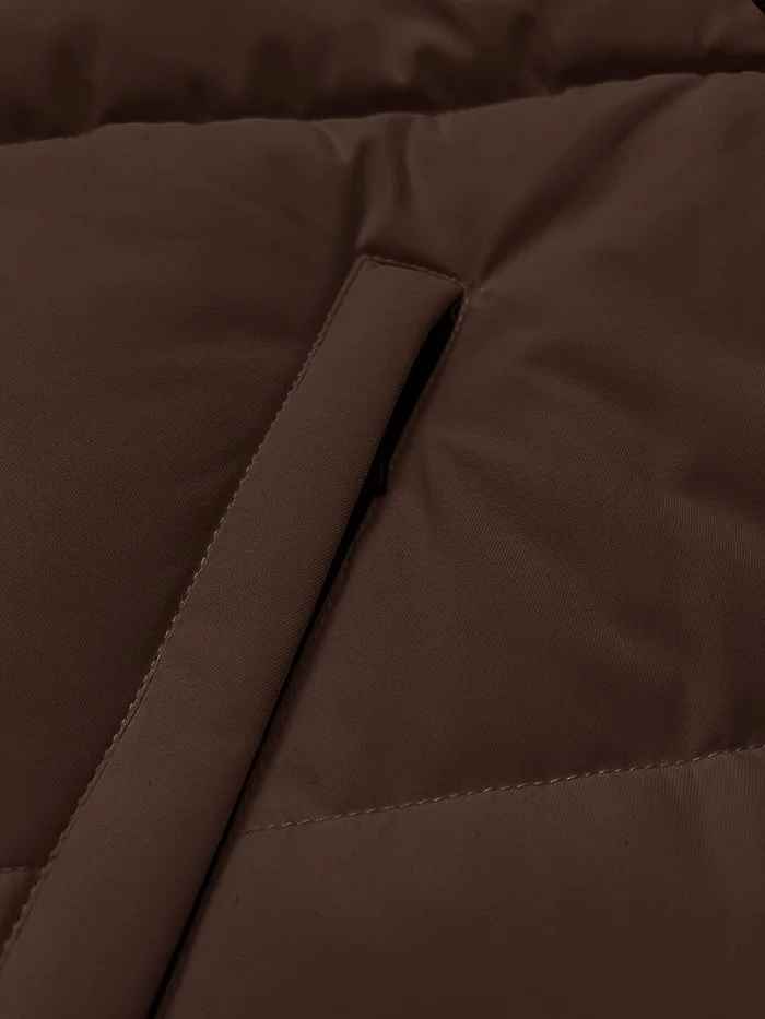 Bunda má vypasovaný střih, je lehce zateplená syntetickou péřovou výplní, má dvě kapsy se zapínáním na zip a zapíná se černým zipem. Kolem kapuce se táhne kožešina, kterou je možné odepnout. Rukávy lemují stahovací lemy s otvory pro palec. Model má délku pod boky.