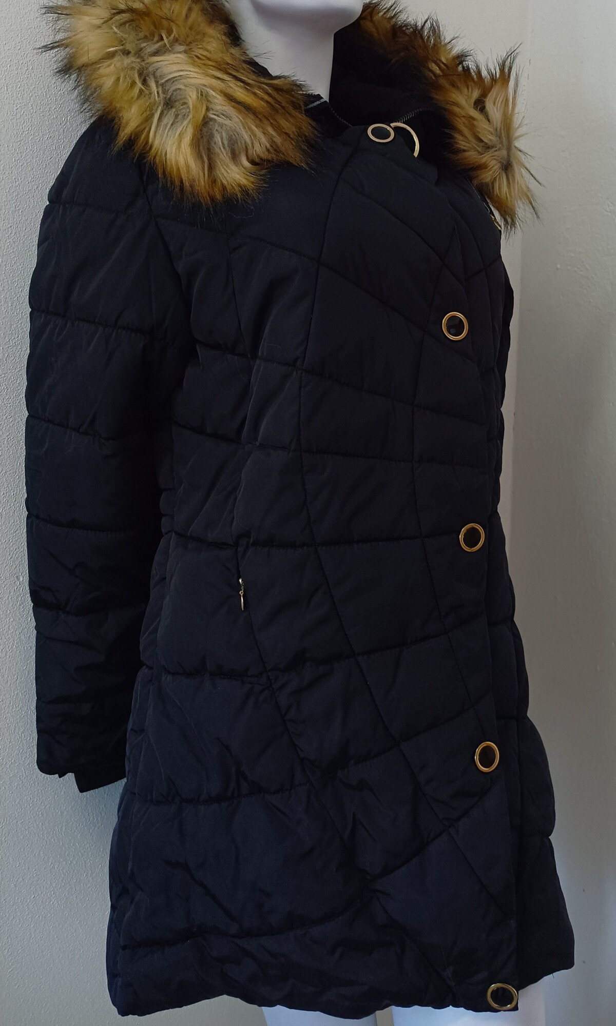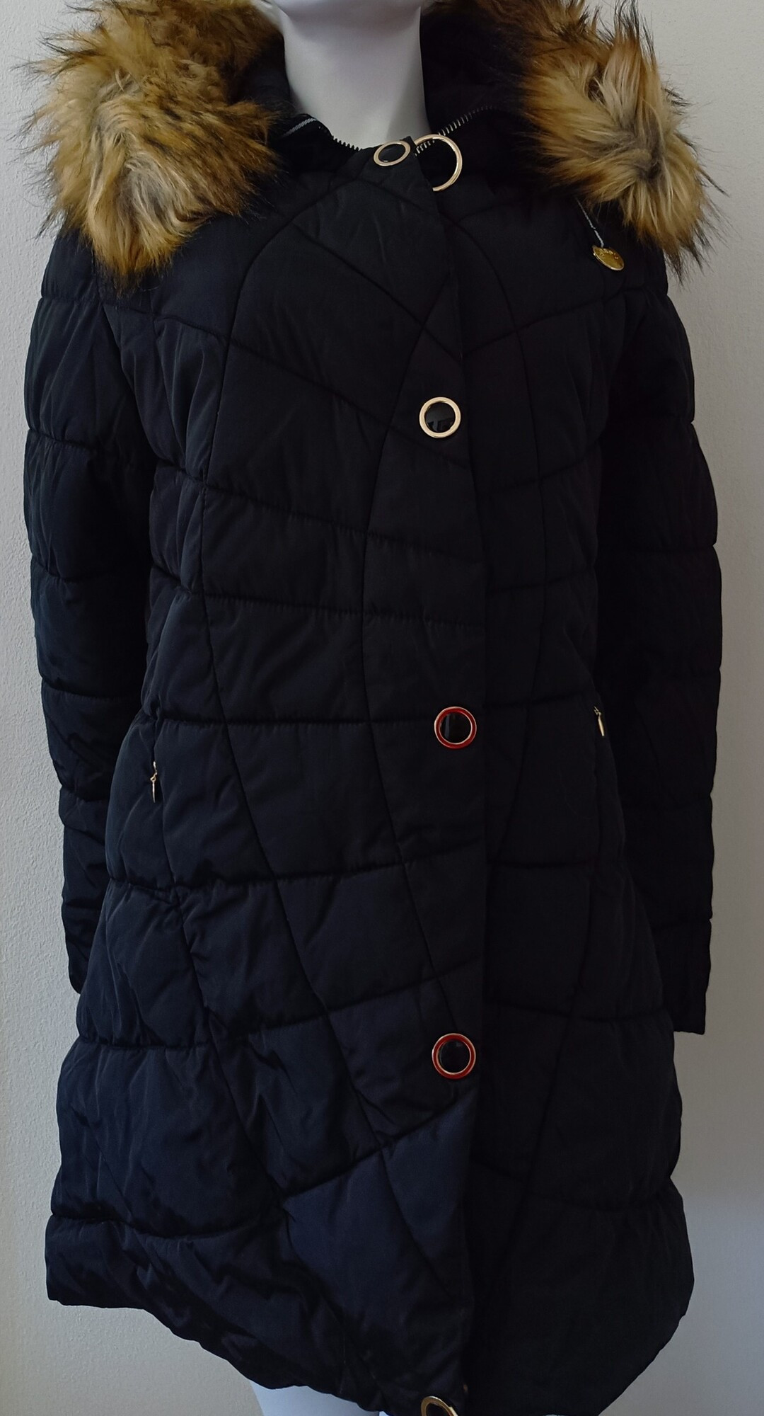 Dámský zimní dlouhý kabát, prošívaný, s kapucí a odepínací kožešinou.