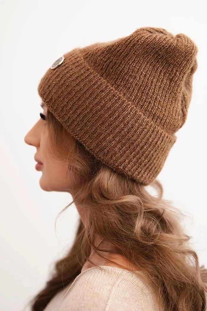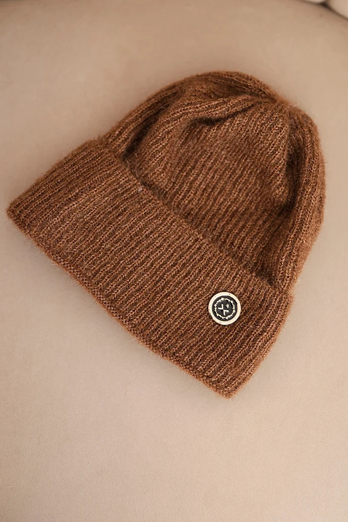 Model je ozdoben zlatým knoflíkem vpředu, což mu dodává eleganci a odlišuje ho od klasických čepic. Jemná, jednolitá barevnost zajišťuje, že čepice se hodí k mnoha zimním stylizacím – jak každodenním, tak i elegantnějším.