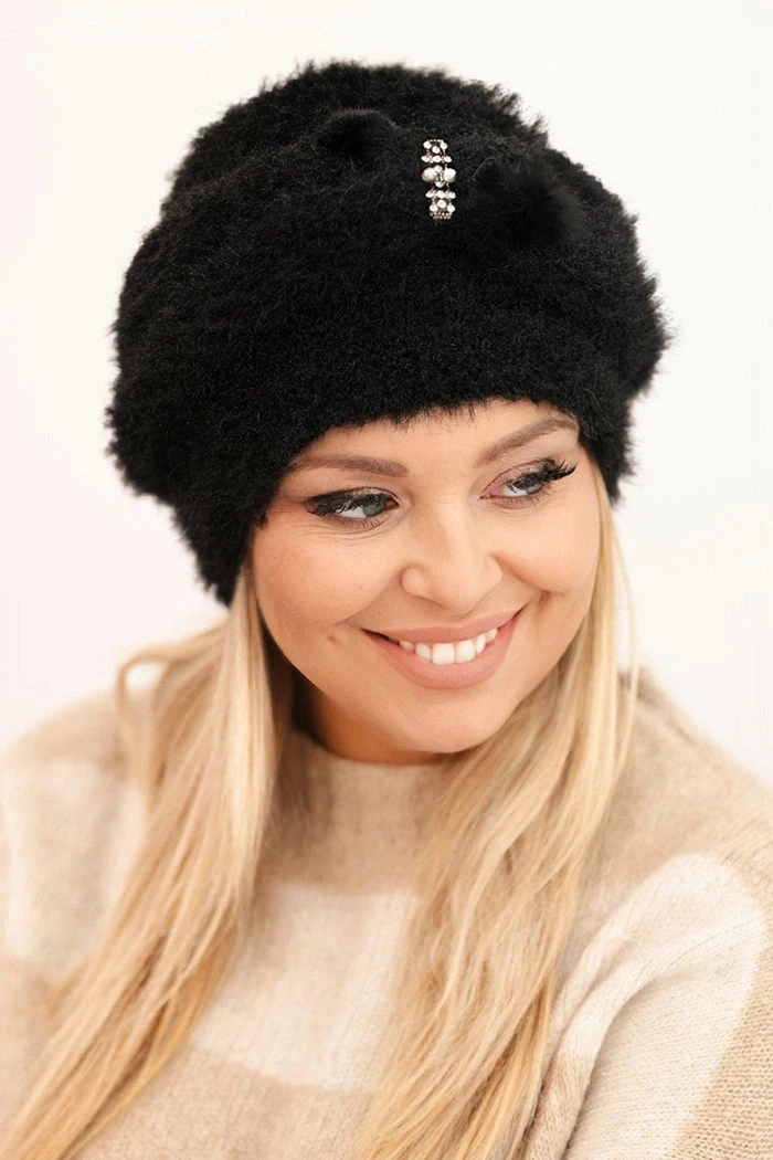 Dámská zimní čepice model 21441596 s ozdobou a kožešinou černá - K-Fashion