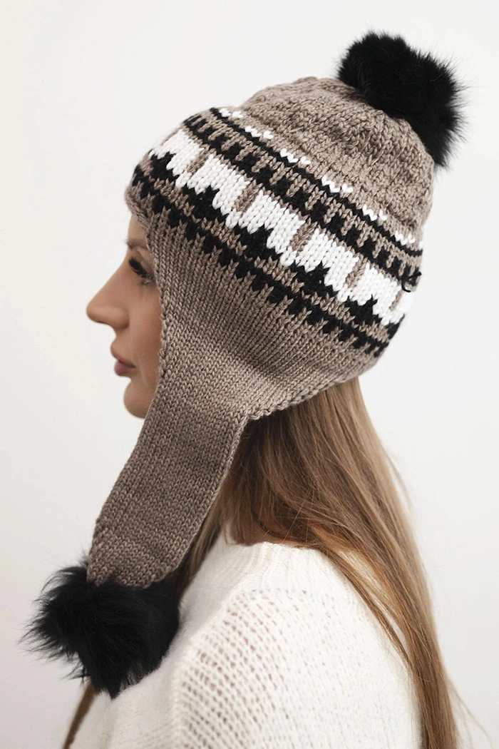 Teplá zimní čepice s efektním vzorem a třemi měkkými pompony – na vrchu a na koncích uší. Skvěle chrání před zimou, zakrývá také uši. Ideální na procházky, zimní výlety a každodenní stylizace.