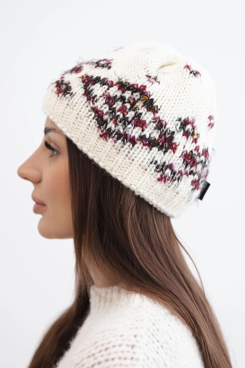 Teplá dámská čepice v klasickém zimním stylu s výrazným norským vzorem. Vyrobena z měkké a příjemné na dotek pleteniny s vysokým obsahem vlny, ideálně se hodí do chladných zimních dnů. Hlavní pletení a elastický lem zajišťují dokonalé padnutí a účinnou ochranu před větrem a mrazem.