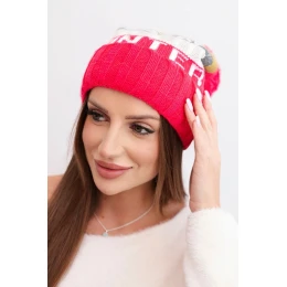 Dámská zimní čepice s vlnou a nápisem s velkým bambulí K422 fuchsie